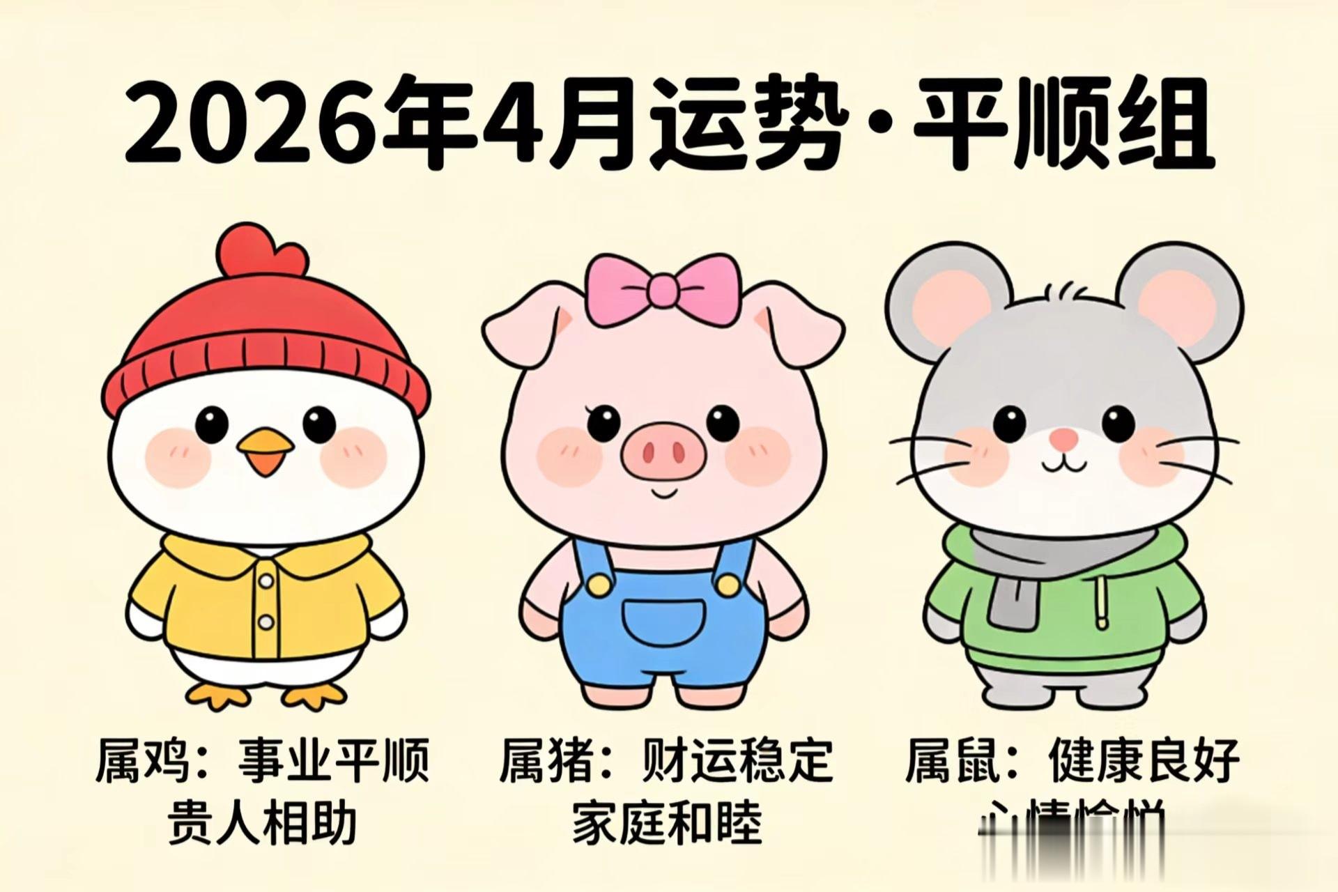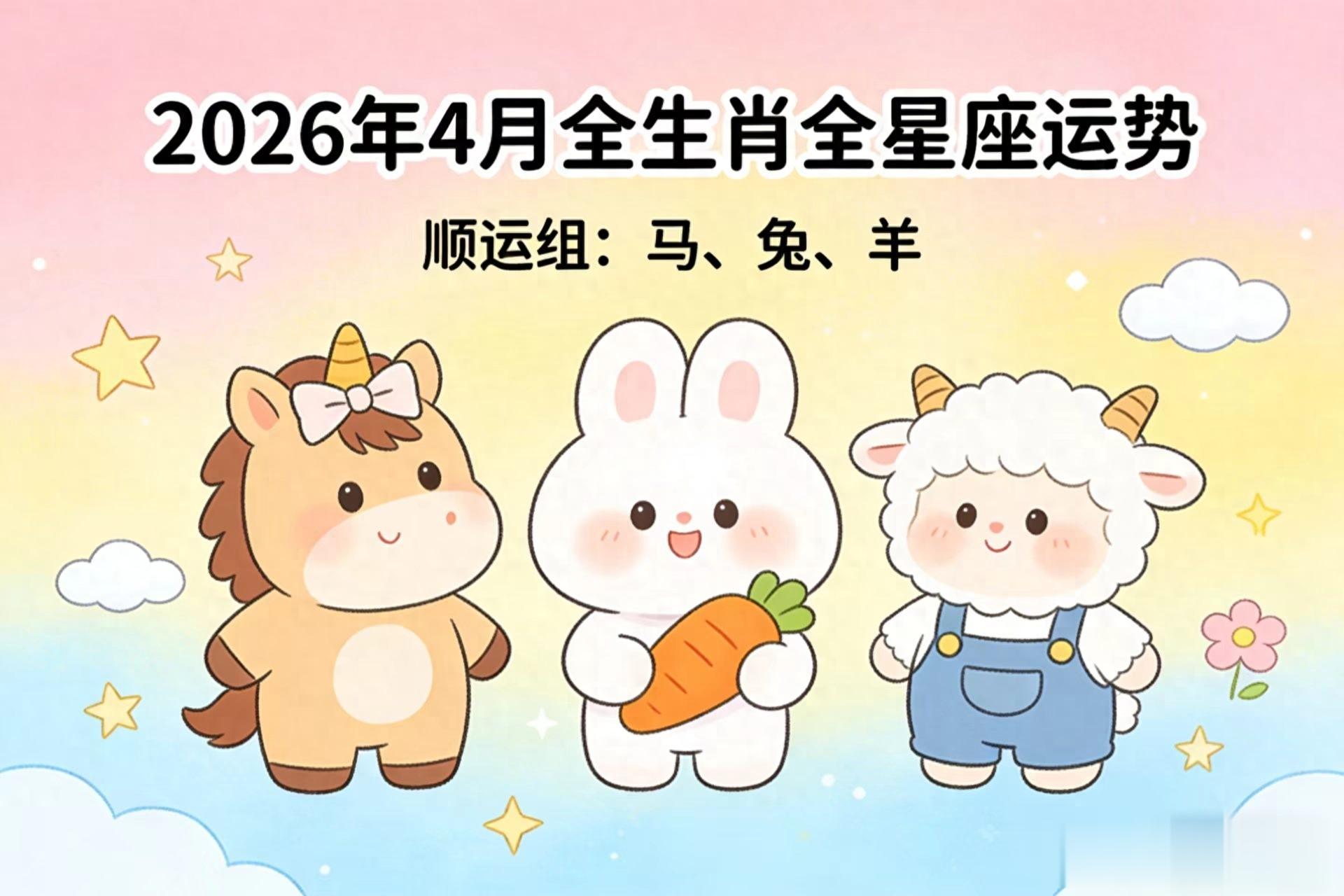 生肖好运梯队顺运组:属马、属兔、属羊四月状态全面回升,做事顺风顺水,心情舒展松弛,好运主动找上门。