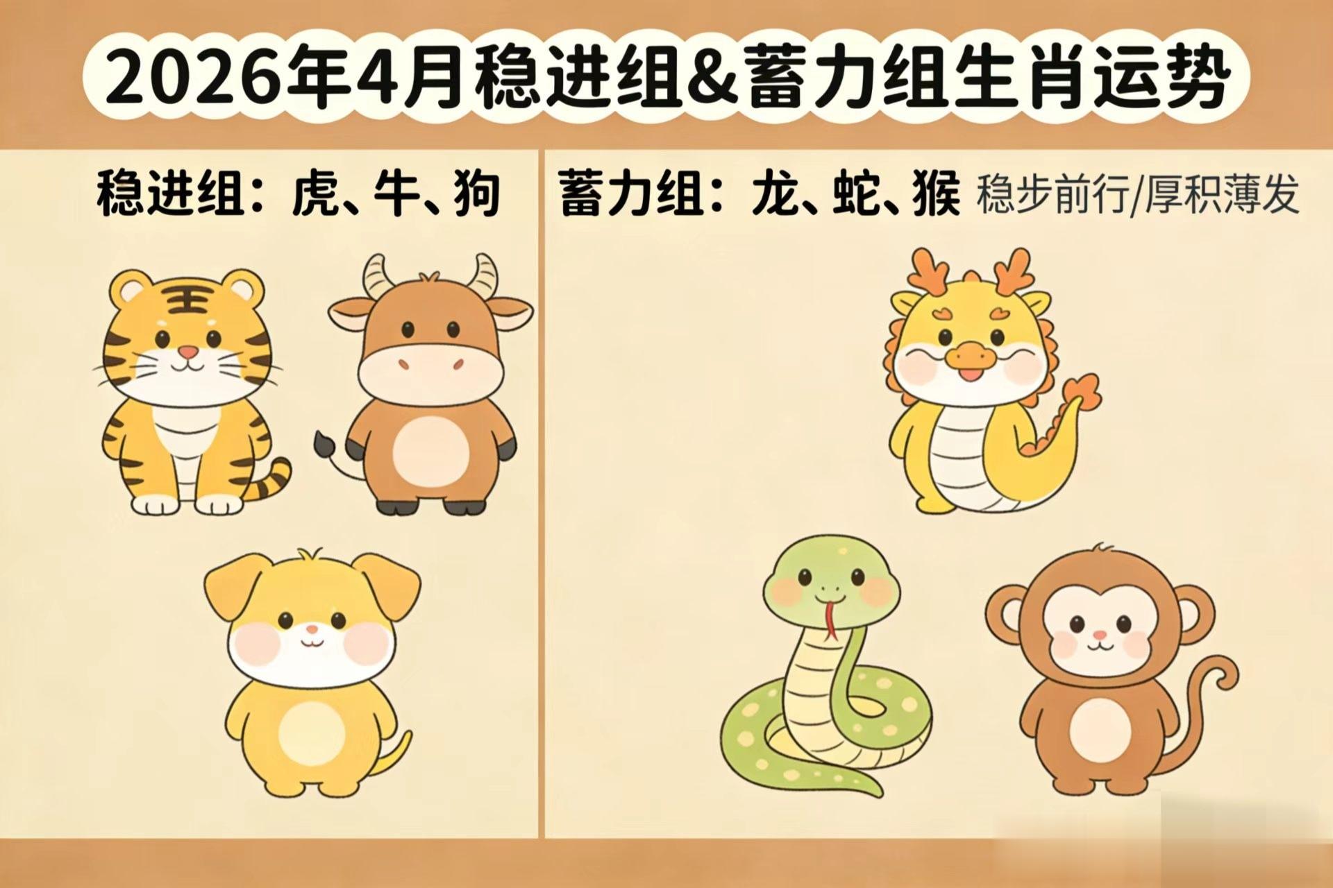蓄力组:属龙、属蛇、属猴四月是蓄力沉淀的好时机,调整状态,弥补短板,后续会迎来明显爆发。