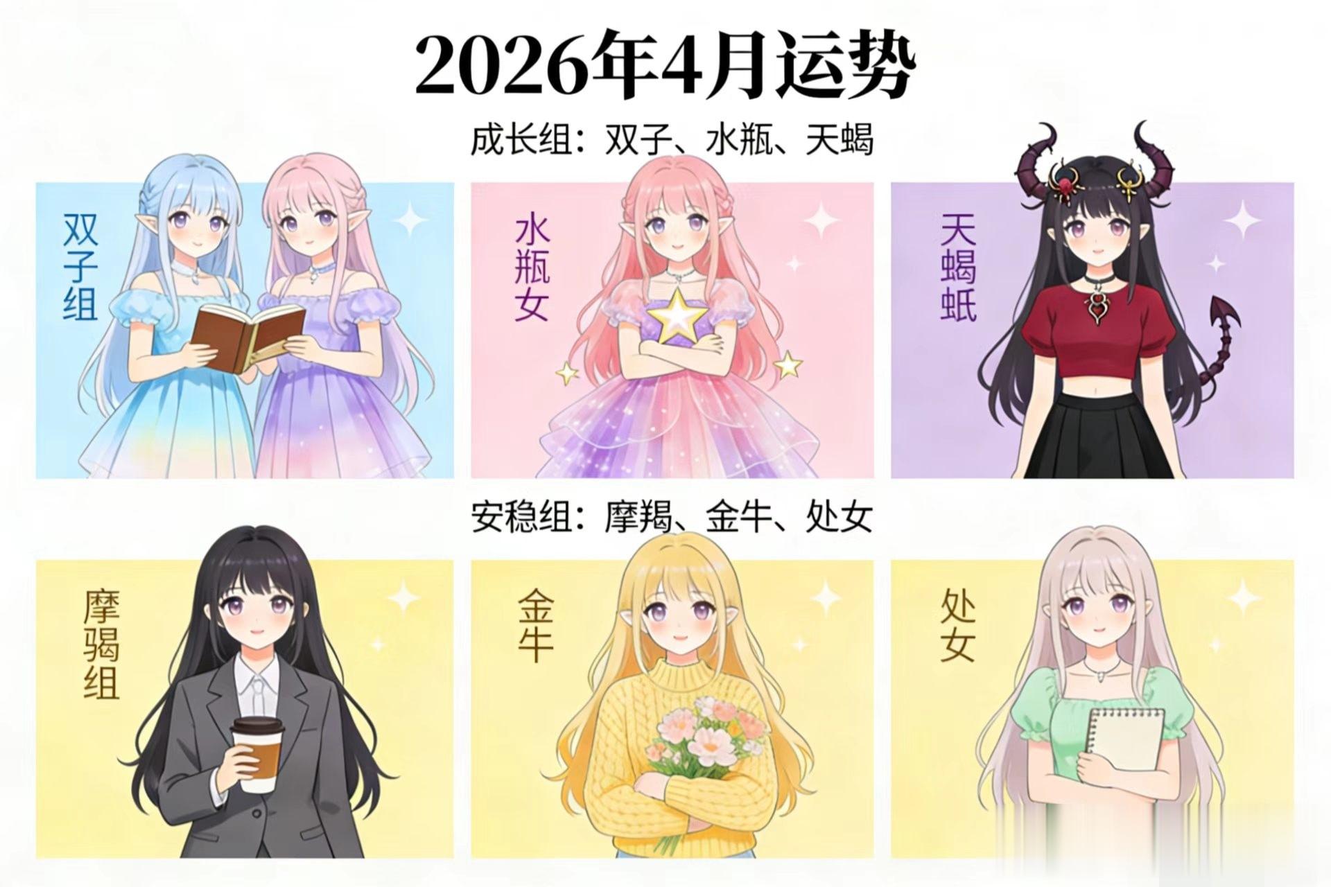成长组:双子、水瓶、天蝎四月是自我成长的黄金期,突破自我、掌握新技能,格局逐渐打开。