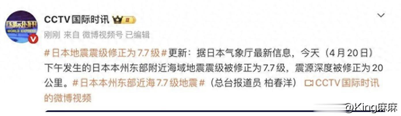 4月20日,日本三陆近海发生7.7级地震,震源深度为20公里,并一度引发海啸预警。