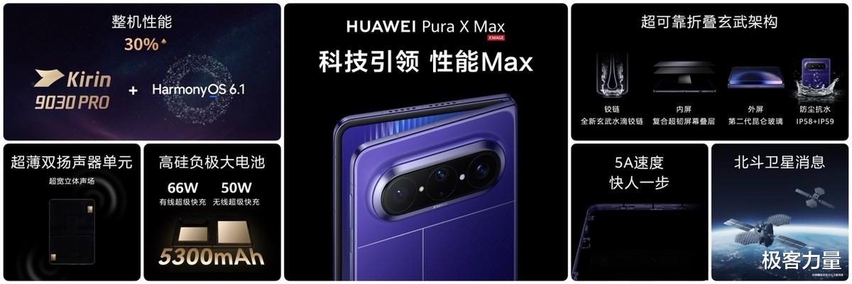 鸿蒙终端设备已突破5500万,全新HarmonyOS 6.1带来悬浮式UX设计与全新智感握姿,实现更开阔、易用的交互体验。此外,搭载超可靠折叠玄武架构,内屏配置三重复合屏幕叠层,外屏采用第二代昆仑玻璃;更支持IP58、IP59级防尘抗水。HUAWEI Pura X Max以领先的折叠架构设计、强大的麒麟9030 Pro芯片、流畅的鸿蒙操作系统6.1和更丰富的鸿蒙生态,实现卓越性能再突破、整机性能提升30%。
