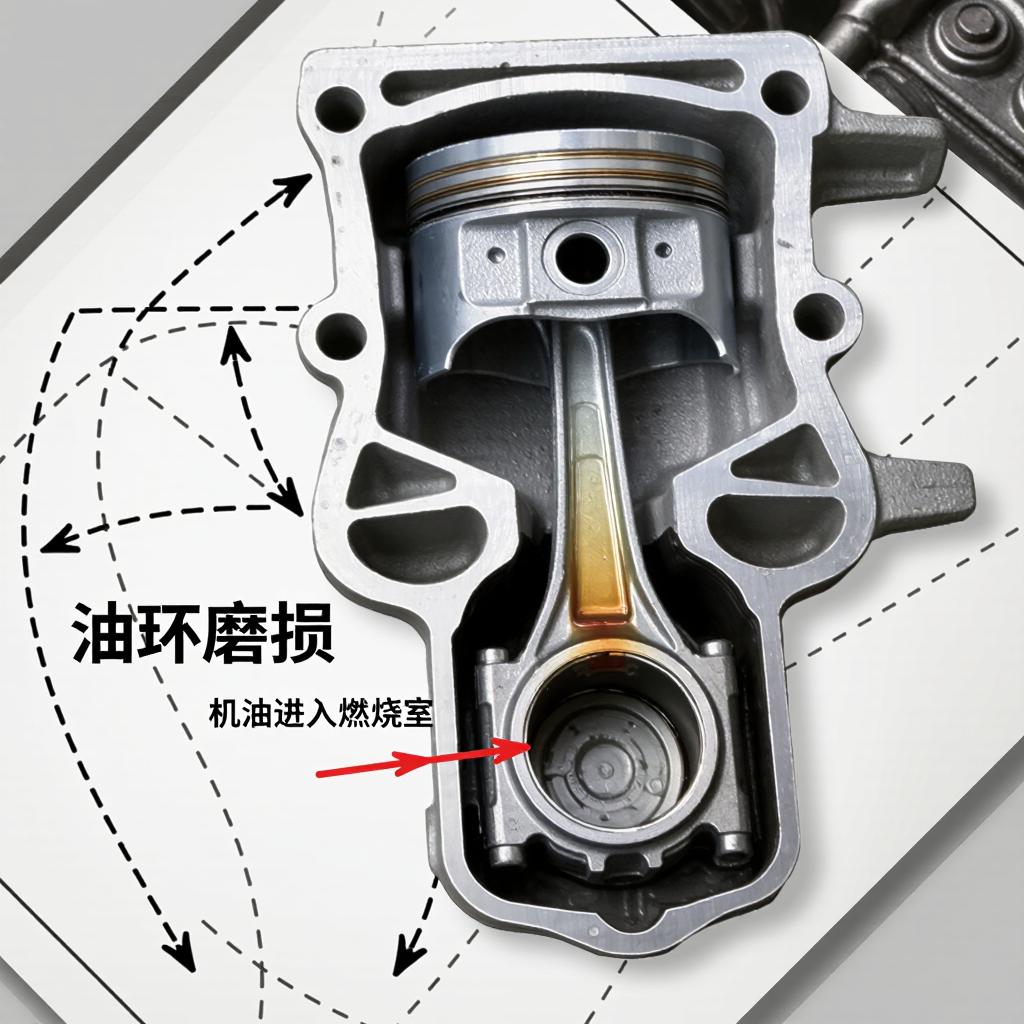 在这一精密循环中最关键的密封环节在于活塞组件。理论上三道气环与一道组合式刮油环应形成迷宫式密封刮除缸壁残余润滑油然而当高温氧化产物与燃油稀释物在活塞第一第二环槽内积聚时会形成坚硬的碳质沉积物即"积碳卡滞"。此时油环环岸失去径向浮动能力回油孔被彻底封堵导致刮油功能失效大量液态机油直接窜入燃烧室参与燃烧这就是典型的机械性烧机油。
