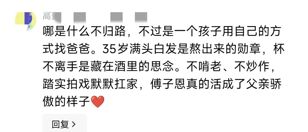 还有网友说,哪是什么不归路,不过是一个孩子用自己的方式找爸爸。35岁满头白发是熬出来的勋章,杯不离手是藏在酒里的思念。不啃老、不炒作,踏实拍戏默默扛家,傅子恩真的活成了父亲骄傲的样子。我觉得他真的太争气了,完全是父亲的骄傲。