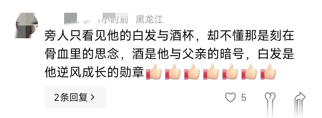 有网友说,旁人只看见他的白发与酒杯,却不懂那是刻在骨血里的思念,酒是他与父亲的暗号,白发是他逆风成长的勋章。我觉得真的太戳心了,这份思念都藏在细节里了。