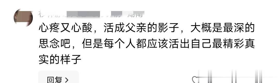 还有网友说,心疼又心酸,活成父亲的影子,大概是最深的思念吧,但是每个人都应该活出自己最精彩真实的样子。我觉得这份思念很动人,但也希望他能活出属于自己的人生。