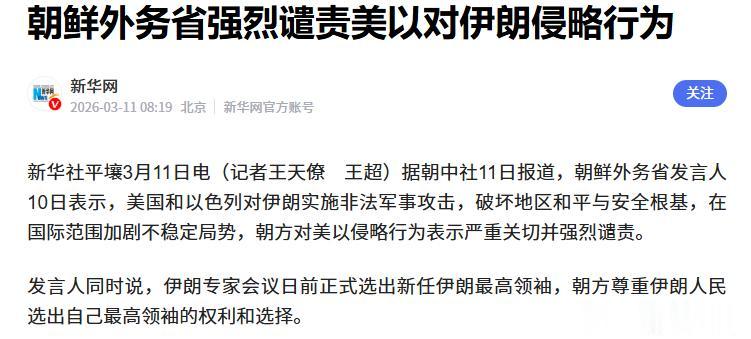 新华社 2026-03-11:朝鲜外务省强烈谴责美以对伊朗侵略行为