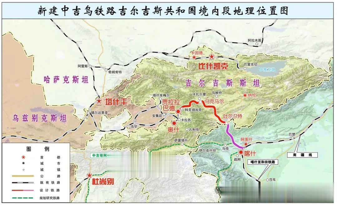 中吉乌铁路采用“准轨+宽轨”分段模式,从我国新疆喀什经吐尔尕特出境到吉国境内的马克马尔路段,采用准轨铁路(1435毫米),从马克马尔经贾拉拉巴德到安集延路段,采用宽轨铁路(1520毫米)。准轨宽轨换装场设在吉国的马克马尔,吉国将在此打造面向中国-中亚的内陆港。