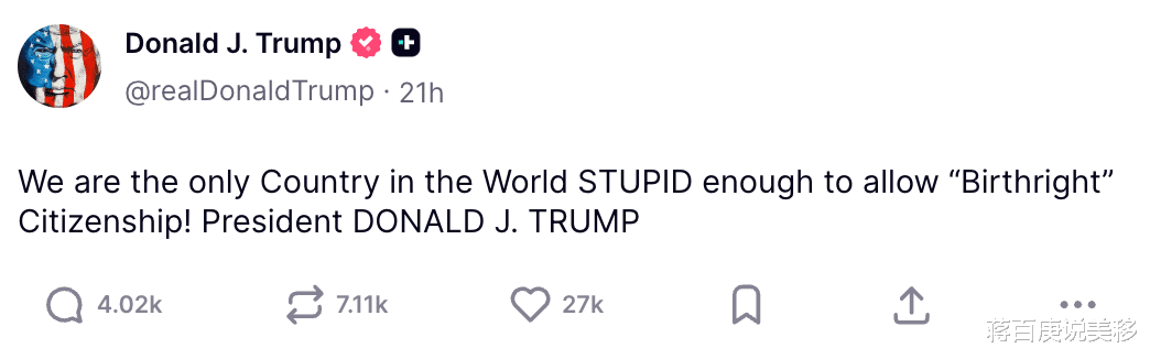 “出生公民权”源于1868年宪法第十四修正案,条款规定“凡在美国出生或归化,并受其管辖者,均为美国公民”。长期以来,人们普遍认为,新生儿只要在美国出生,无论父母国籍和居留状态,均可自动获公民身份。而特朗普的行政令规定,父母为非法入境或无证务工者的新生儿,不再自动获得公民身份。政策一出便引发分歧,22个民主党执政州次日起诉,纠纷拖了一年多后进入最高法院终极审理。