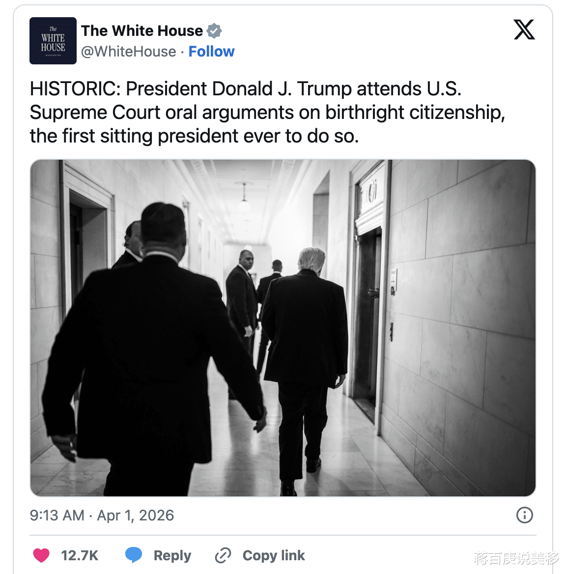 当地时间2026年4月1日,美国联邦最高法院就“出生公民权”案件展开口头辩论,焦点是是否废除这项实行150多年的规则。特朗普亲自旁听,成为美国首位旁听此类案件的在任总统,足见其重视,也将美国移民政策的深层分歧公之于众。此次审理的核心,是审查他2025年1月20日重返白宫当天签署的限制出生公民权行政令是否合宪。