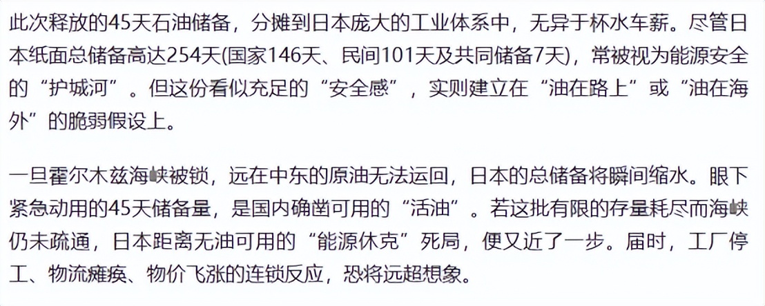 日本在原油炼化成成品油的过程中,还需要一个关键原料石脑油,相关储备只够20天,石脑油一断,就算有原油也炼不出来,这才是大问题。