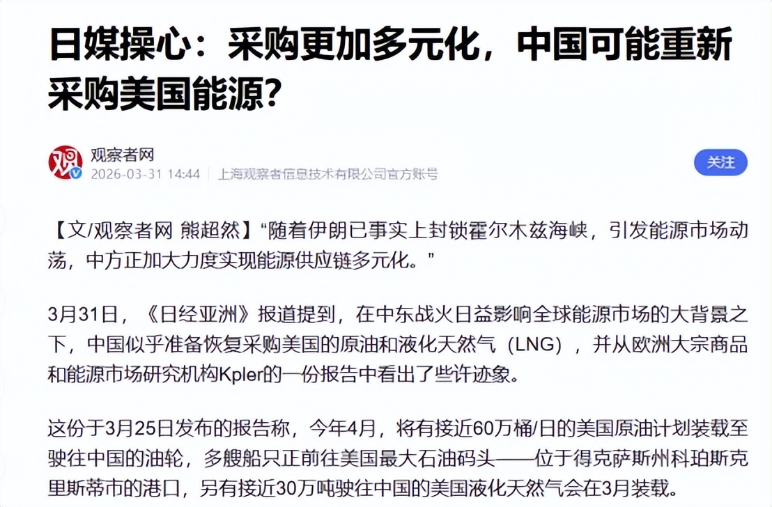【信源:观察者网2026-3-31日媒操心:采购更加多元化,中国可能重新采购美国能源?