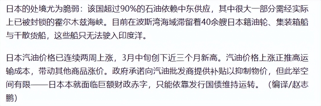 而且,日本能源的脆弱性在这次油荒危机中一览无余,作为全球排的上号的工业大国,原油对外依存度高达99.7%,本国基本不产油,全靠进口,危机从3月初就开始体现,海峡被封锁后,40多艘日本油轮滞留波斯湾,无法返回日本。