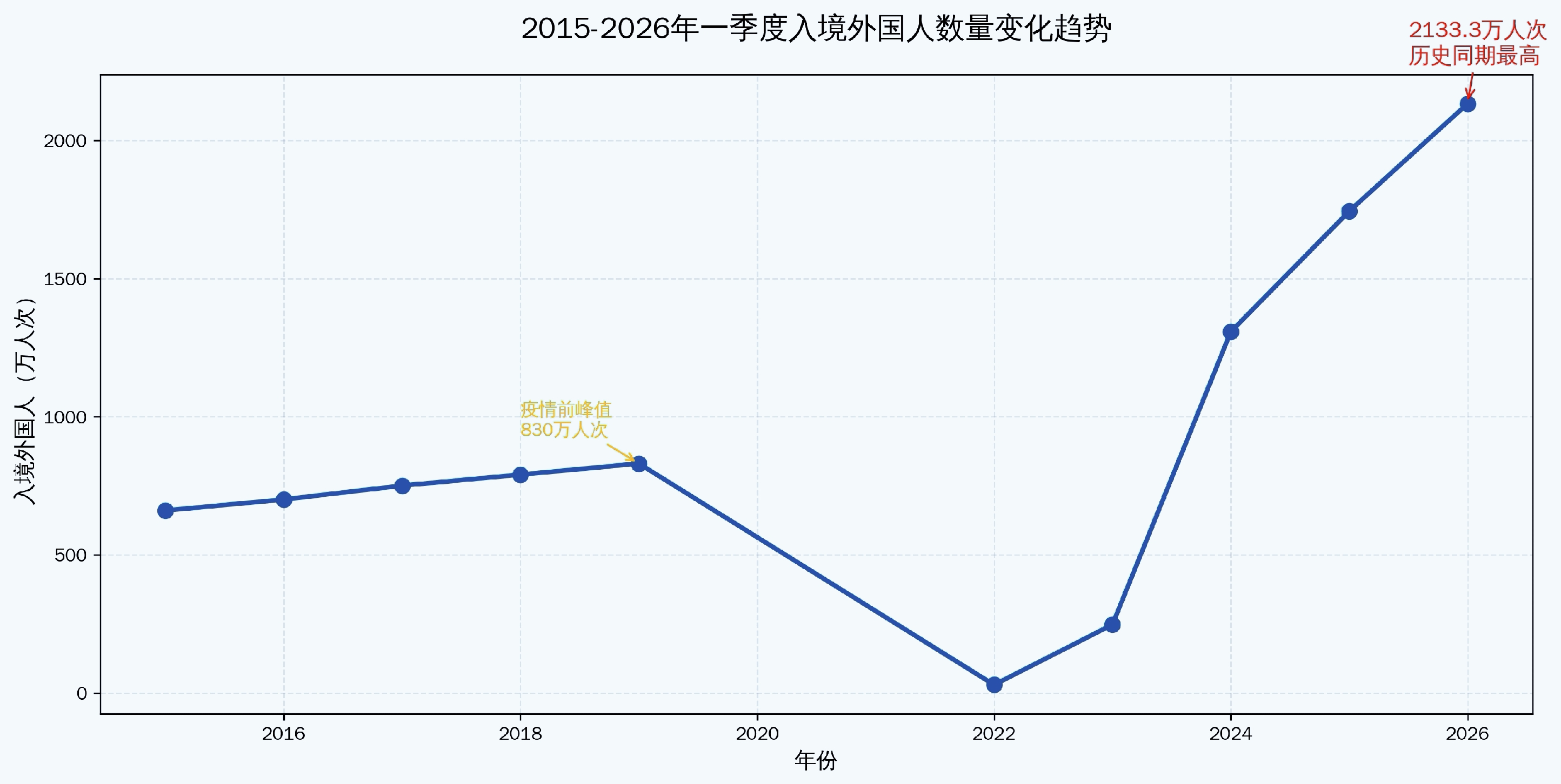 此后每一年入境人数都有两位数的增长,所以,2026年一季度不出意料的再次刷新纪录。