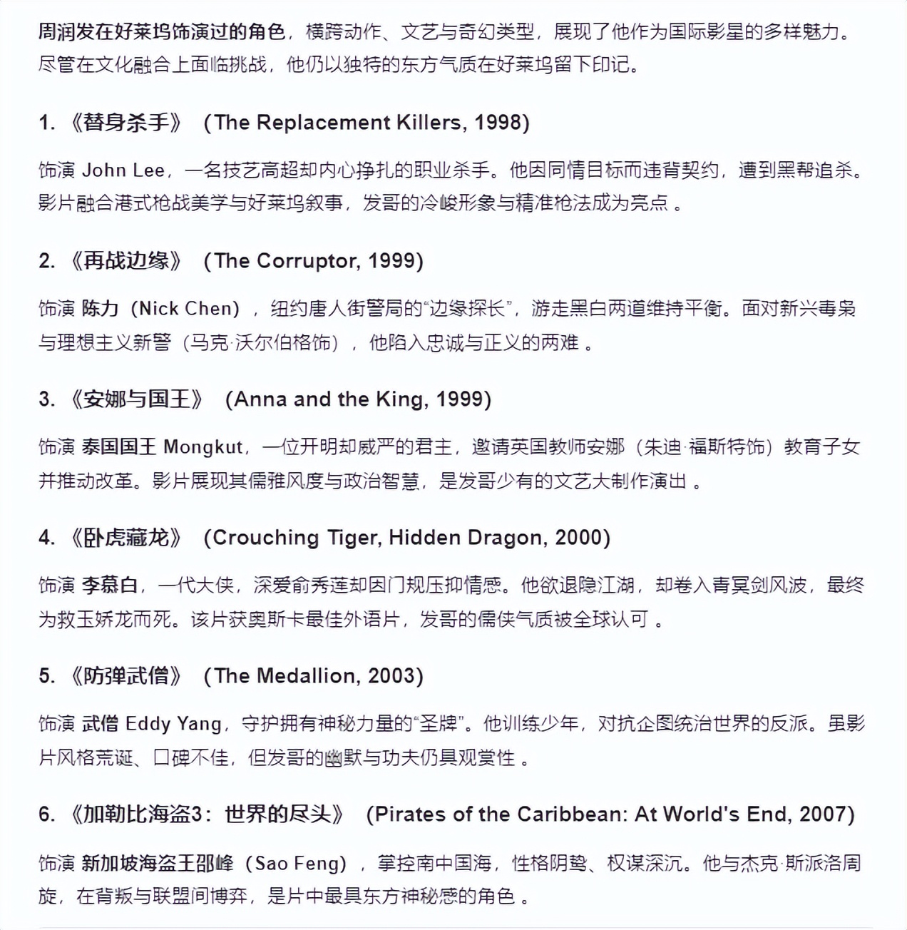 因为从1998年《替身杀手》进军好莱坞,十年时间,周润发演的最后一个角色是2007年《加勒比海盗3:世界的尽头》 新加坡海盗王邵峰。