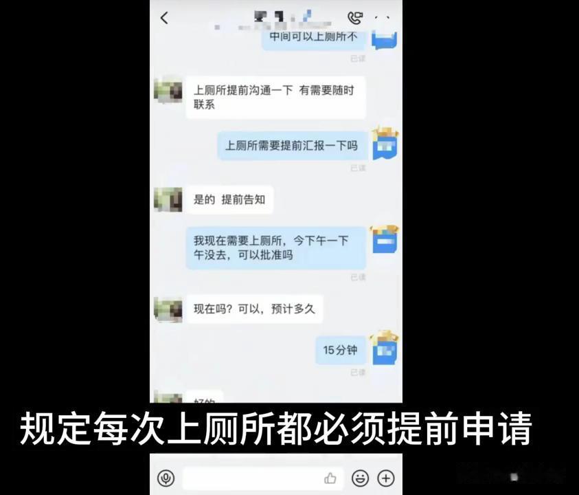 有人晒出办公室照片,每个工位装摄像头,员工一举一动被监视,比监狱还恐怖;有人晒出工作群聊天记录,项目领导发话:“既然到了本项目,首先以工作为主,家里死人的先臭着,把项目安排好再处理个人事。” 听听这是人话吗?还有企业为降本增效,规定上厕所需提前申请,写明干什么、要多久,排队还得申请延长 —— 连基本的排泄自由、隐私自由都被限制。更有公司因部门员工业绩不达标,惩罚吃 “死神辣条”,两名员工吃完胃痛、浑身冒冷汗被送医,还留下后遗症。员工的生命健康在 “业绩” 面前一文不值。