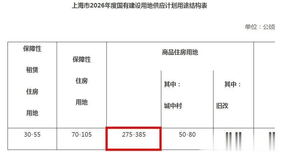 今天上午,上海市规划和自然资源局发布了《上海市2026年度国有建设用地供应计划》,其中明确:商品住房用地计划供应275-385公顷,较去年缩减了26.7%。