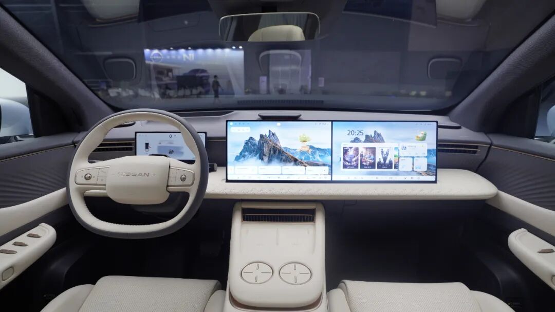 内饰方面,环抱式座舱,提供米白、雅黑两种内饰配色,256色光瀑式氛围灯与水波纹门饰板结合为一体,双辐式多功能方向盘搭配电子怀挡,前排配备10.25英寸仪表盘+双15.6英寸连屏设计+63英寸AR HUD抬头显示,内置NISSAN OS 2.0、高通8295P芯片、四音区智能语音。
