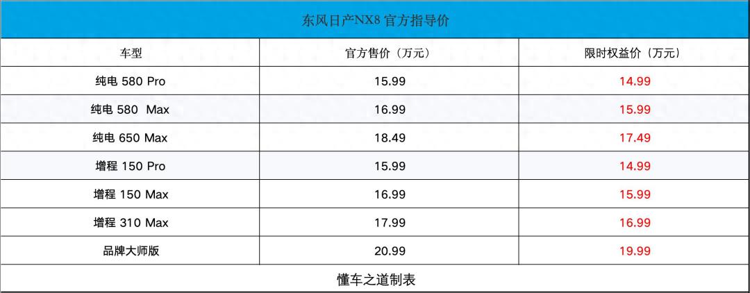 【懂车之道产品】近日,懂车之道获悉,广州·白云,4月8日,我们从官方获悉,东风日产NX8正式发布上市,共推出7款车型,官方指导价15.99-18.49万元,限时权益价14.99-17.49万元。此外,官方还推出了NX8品牌大师版,官方指导价20.99万元,限时权益价19.99万元。下面,和大家一起来看看新车的产品力如何?