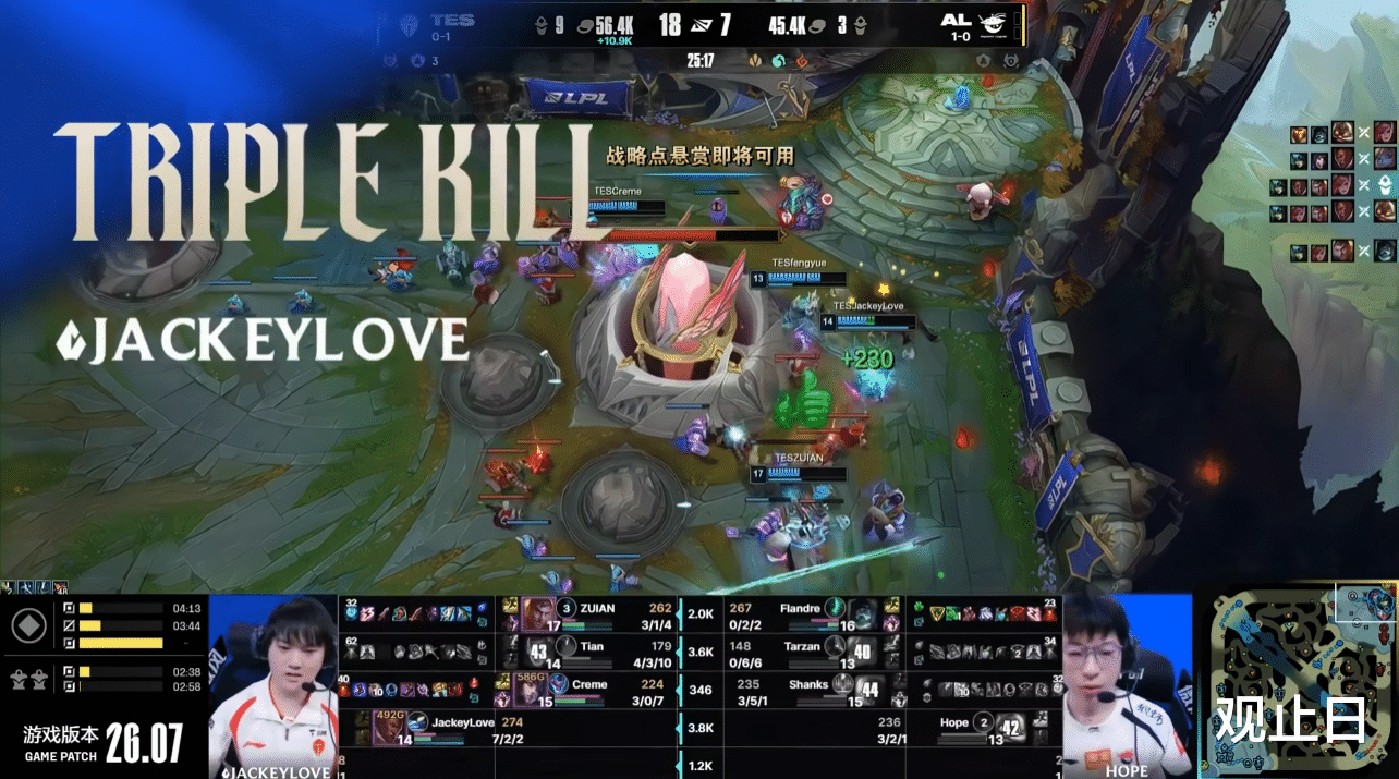 此前复出的JackeyLove四局0杀22死,被钉在耻辱柱上。结果面对联赛前三的AL,上单Zuian纳尔两度单杀Flandre鳄鱼,彻底盘活上路。第一局TES一度落后7.5k经济,最终局JackeyLove艾希三杀终结翻盘,拿下了复出以来首个击杀。第二局彻底碾压,25分钟速通AL。