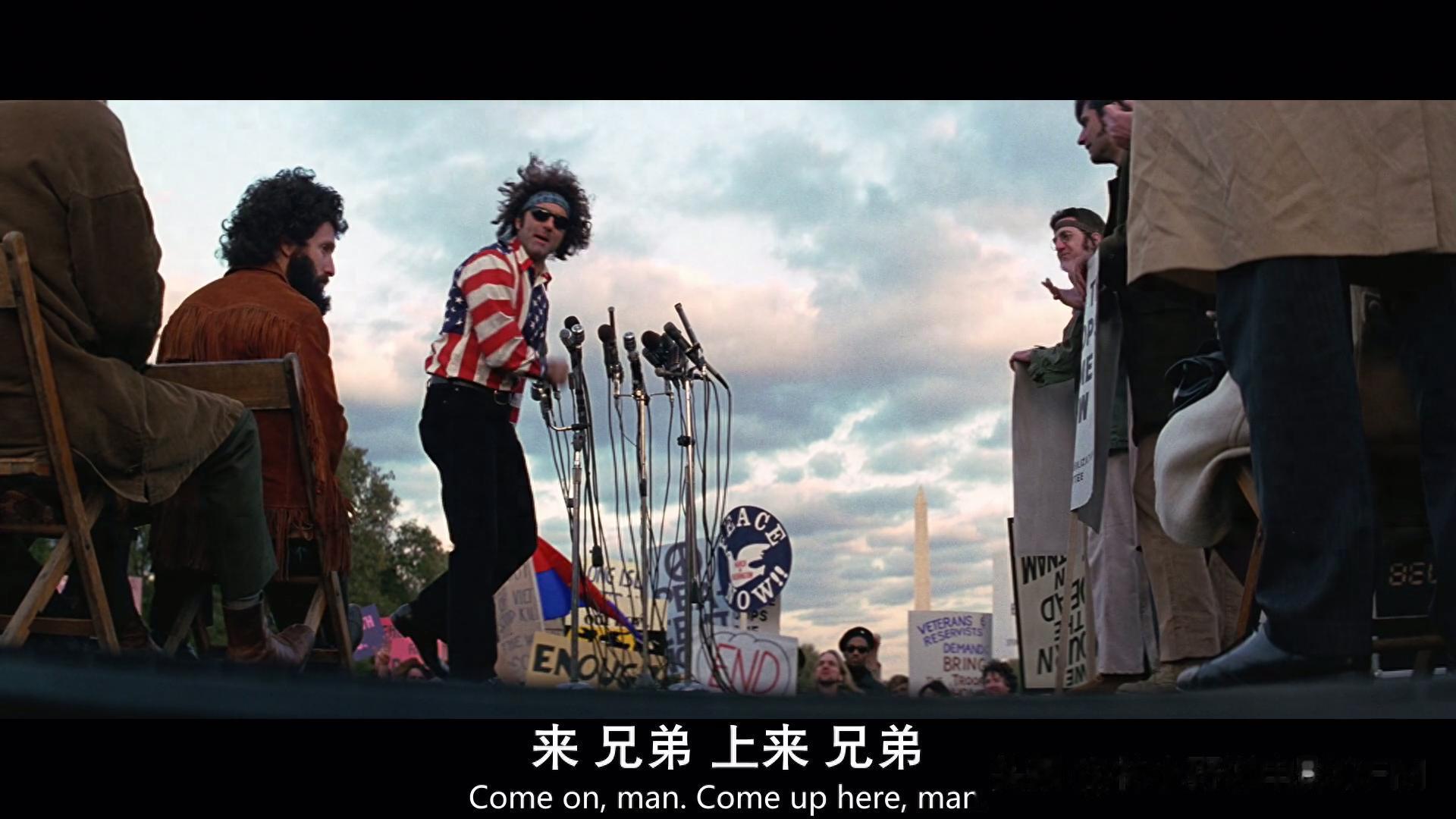 在这部向六七十年代嬉皮风潮反攻倒算的电影中,怎么可以不捎上艾比·霍夫曼这个妖孽呢?