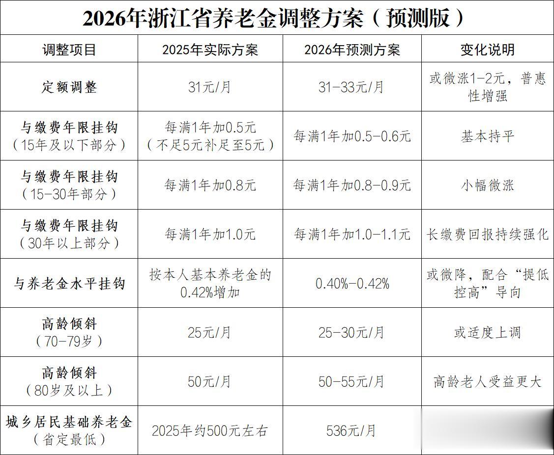 二、2026年浙江养老金方案,可能会有哪些变化?与2025年相比,2026年浙江养老金调整预计呈现“三结合延续、提低控高强化”的特征,定额调整或小幅上调,挂钩结构持续向长缴费者倾斜,高龄关怀力度进一步加大。