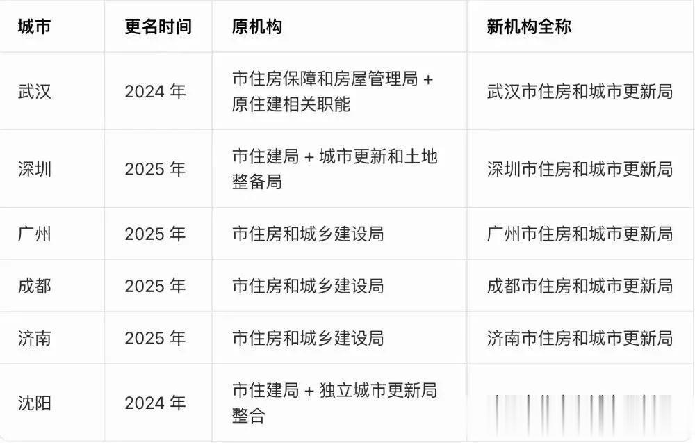 截至2026年3月底,全国已有湖北全省以及10余个重点城市完成“住房和城乡建设局”更名为“住房和城市更新局”: