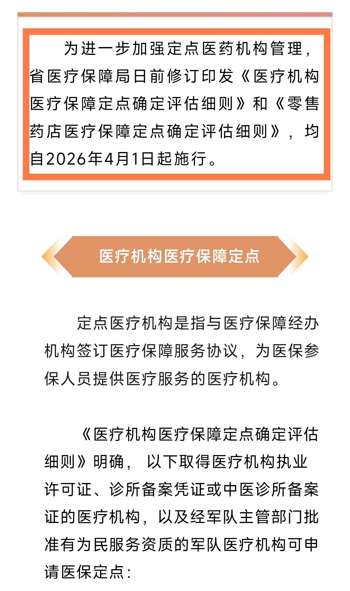 二、医保定点出新规省医保局发布新版医保定点医疗机构、药店评估细则,4月1日起正式施行 。