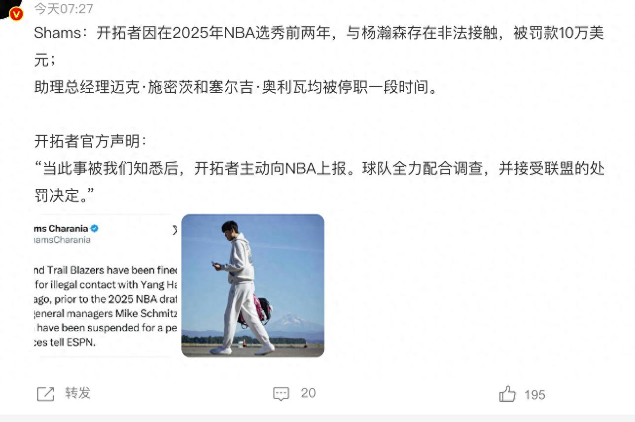 想必关注杨瀚森的球迷最近都收到了一个消息,那就是在新老板上任的第二天,开拓者被曝光遭到NBA联盟的处罚。