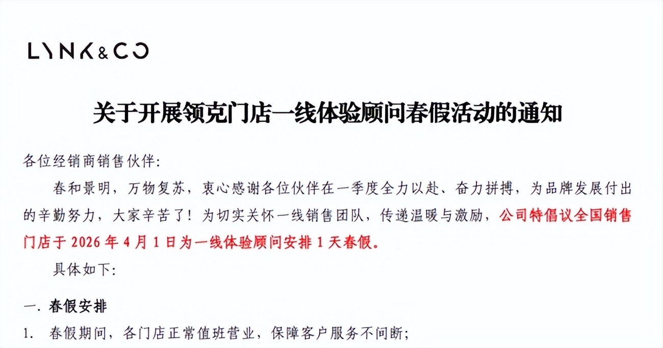 “别人家的公司”这个梗,在职场人的圈子里已经流行了很多年。每次看到别人家的公司发福利、搞团建、放长假,评论区里都是一片“慕了慕了”的声音。而这一次,“别人家的公司”轮到了领克汽车。就在最近,领克做出了一件让无数打工人羡慕的事——给所有一线员工放一天带薪春假——无需抵扣年假、不调休、也不影响正常薪资发放。消息传出后,朋友圈瞬间炸了锅,无数人感叹:同样是上班,为什么差距这么大?