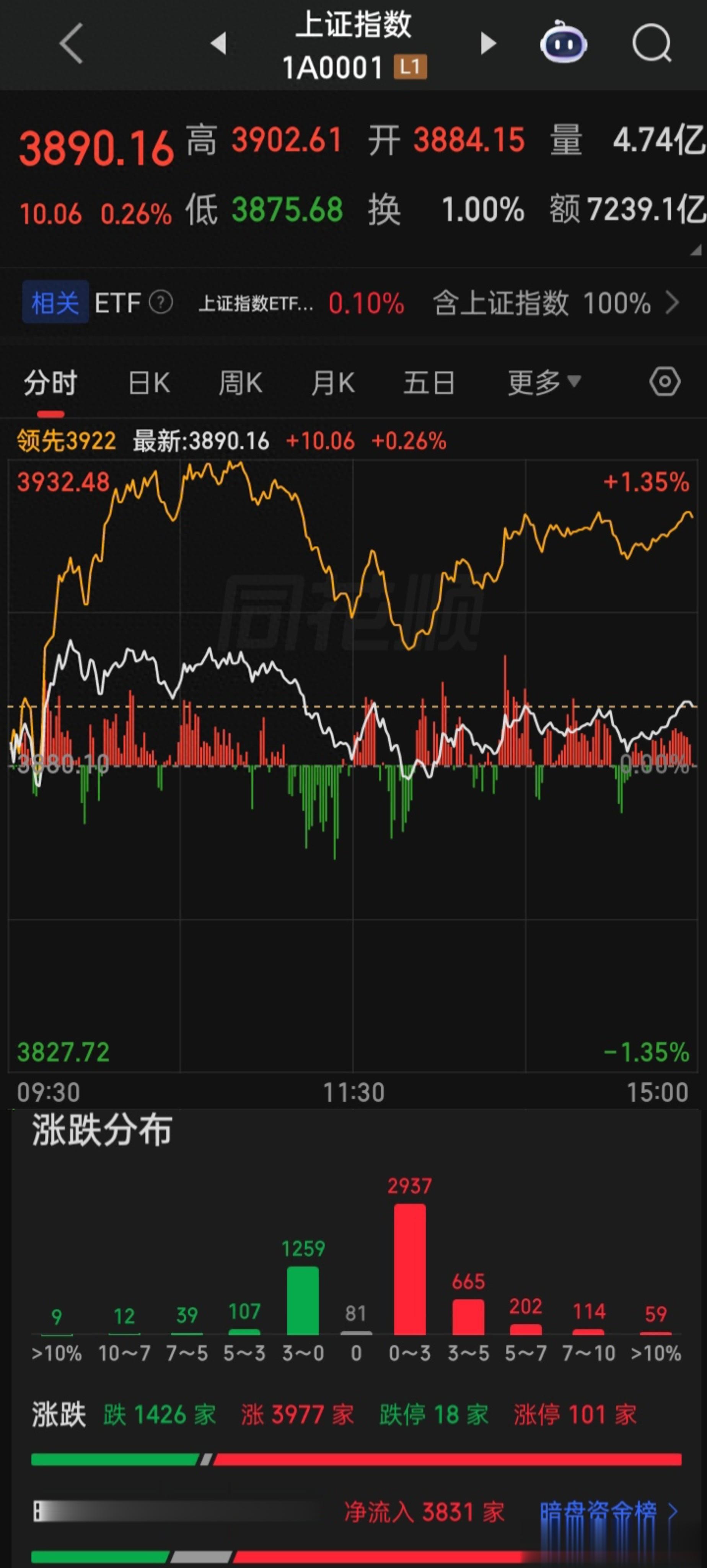 上证收3890.16,涨0.26%,成交7239亿,深证成交8904亿,创指成交3971亿,共成交16235亿,比上个交易日缩量453亿,上涨3977家,下跌1426家,涨停101家,跌停18家