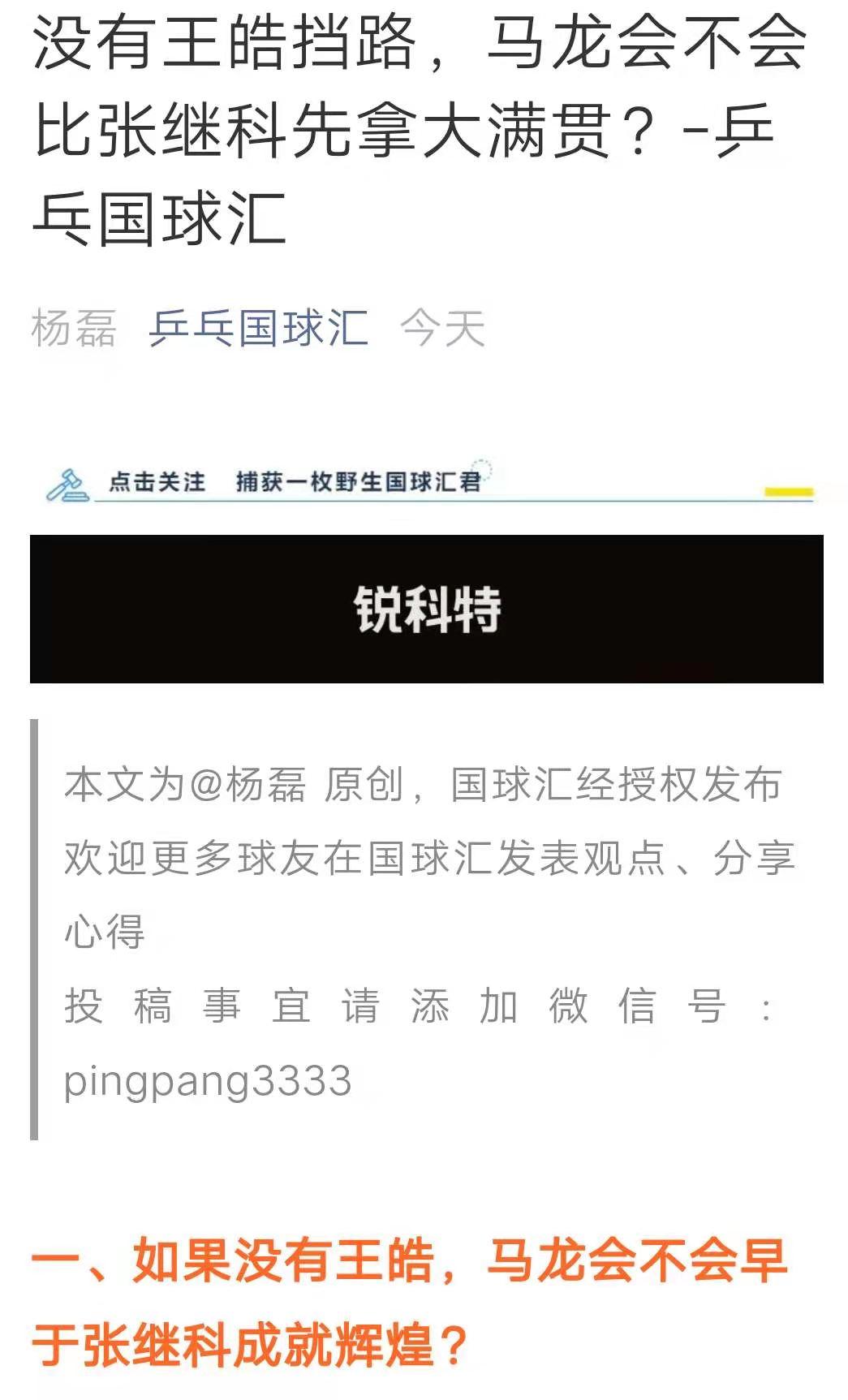“没有王皓,马龙会不会先张继科拿到大满贯?” 一个很有意思的话题,前一段国球汇投稿,发出来了,很开心,没想到下面留言争议很大。 借题发挥,我又换了一个角度,写了一篇新文章,喜欢可以关注 地址: