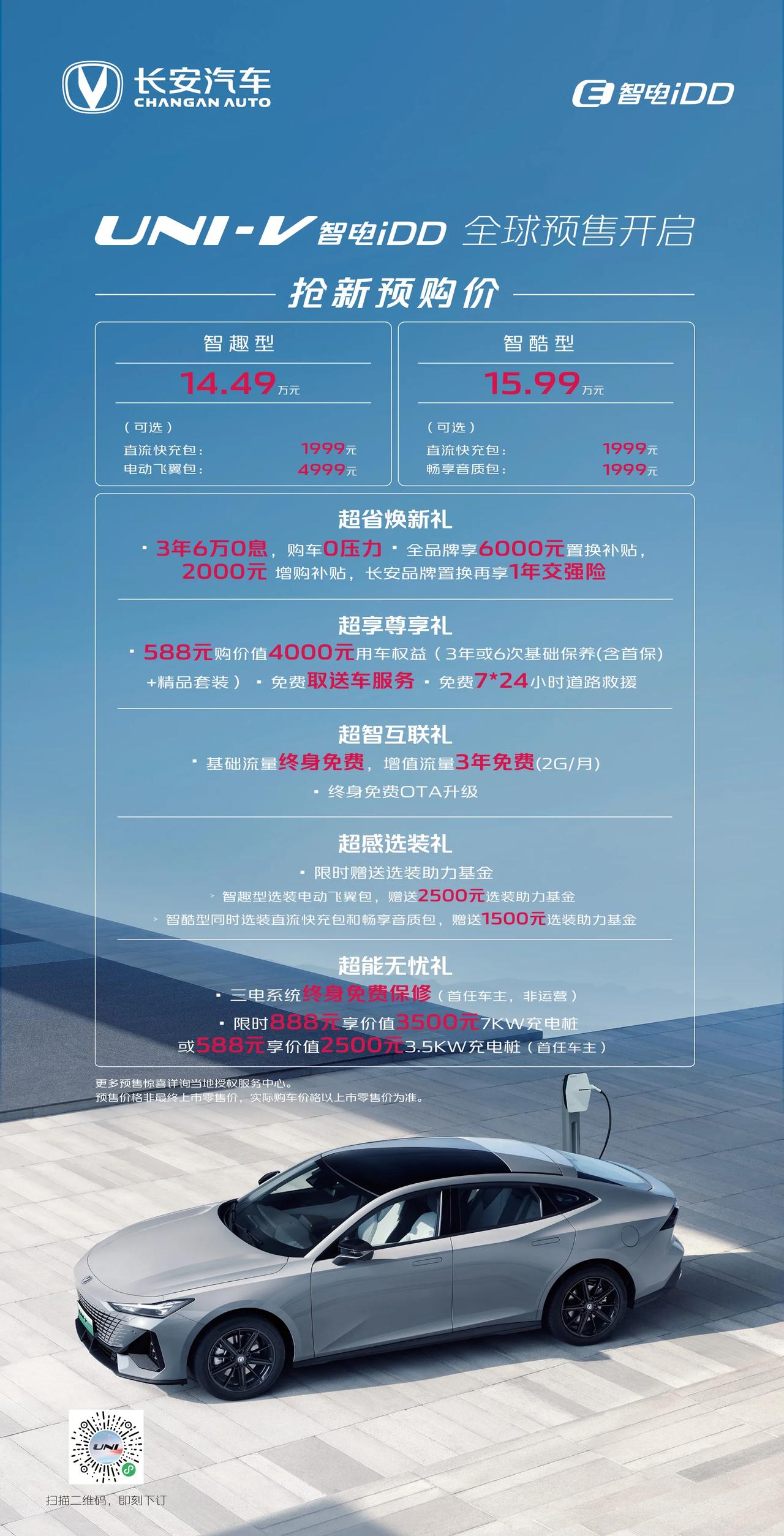 智电iDD双车开启预售。 UNI-V智电iDD,两款车型,分别是14.29万,15.99万。 UNI-K智电iDD,四款车型,分别是18.79万,19.49万,20.79万,21.59万。 UNI-V 智电iDD价格不算贵,落地价比燃油车没贵多少;UNI-K智电iDD,和UNI-K iDD比较,入门车型价格相当,可选车型更多。 预订礼,还是很有诚意的。