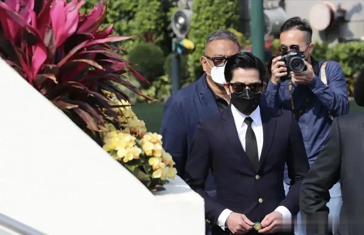 你们有没有认真的看看照片,这个场合郭富城打着黑色领带,身边的人和他手上拿着花,这应该是参加某人的丧礼。参加丧礼的礼仪就是要把西装的俩个扣子都扣上。