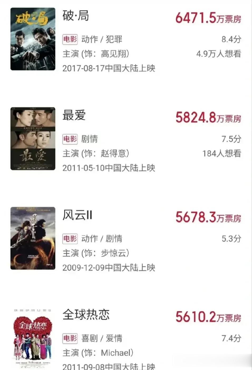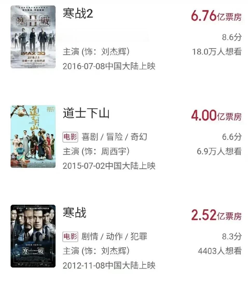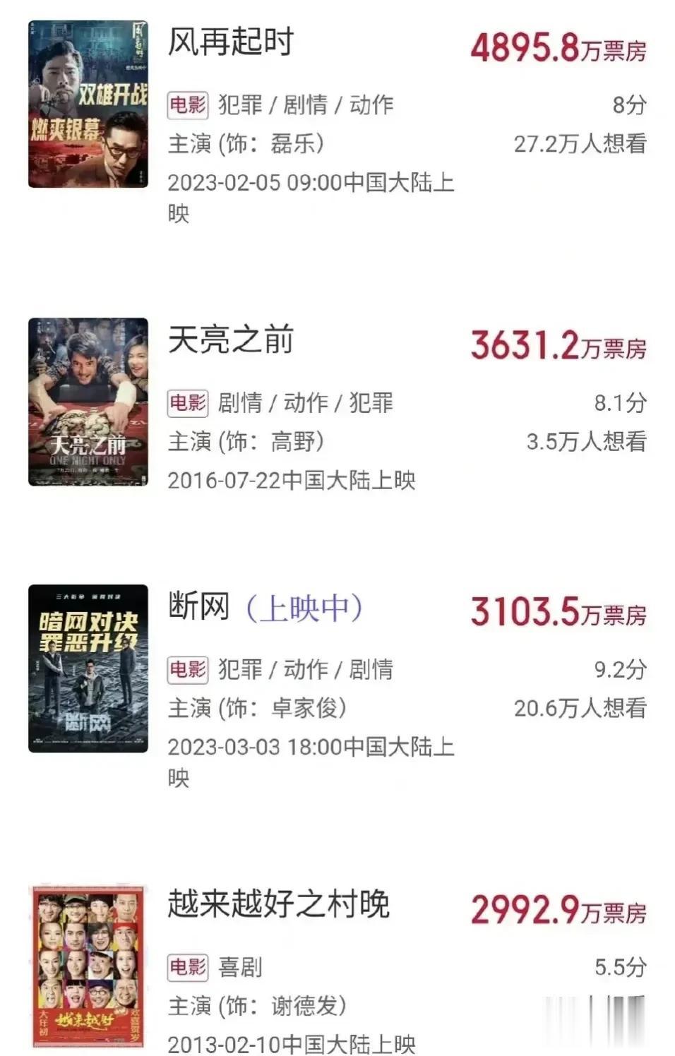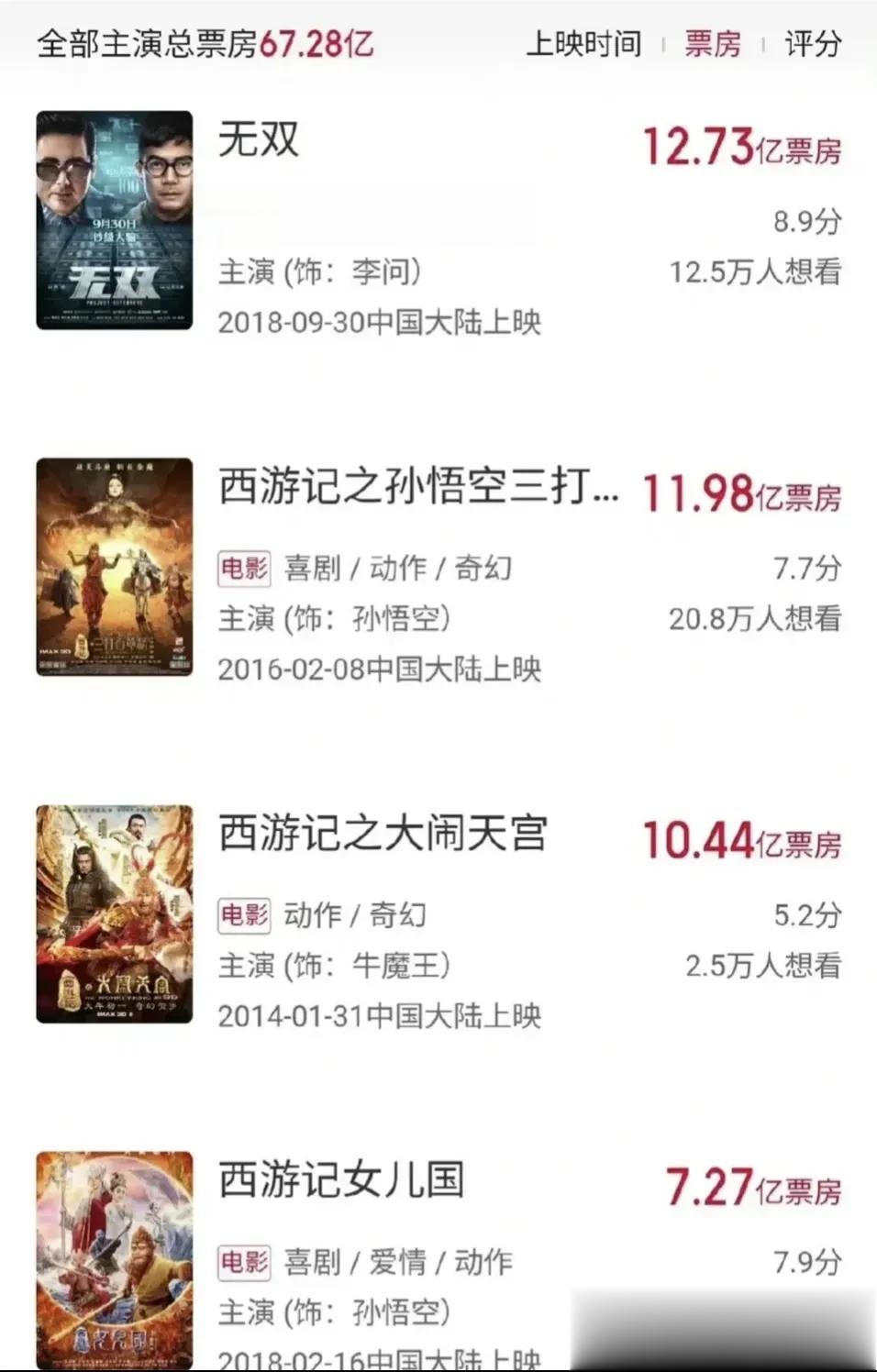 从以往郭富城的电影票房成绩来看,感觉他单杠票房的能力真的挺弱的,虽然当年的《无双》票房超过12亿,但大家主要是去看周润发,《西游记之孙悟空三打白骨精》近12亿,大家主要是去看巩俐的,《西游记之女儿国》7亿多,大家是冲着赵丽颖去的,其实郭富城拍的很多电影票房都不高,甚至有很多都是亏本的,像最近他主演的《风再起时》及《断网》这两部商业大片,票房更是低到让人难以置信的地步!