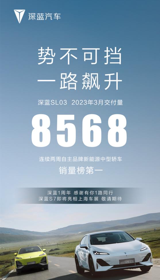 真香! 8568辆!深蓝SL03公布了3月份销量。连续两周,中级车销量榜首。 受特斯拉降价影响后,深蓝SL03于3月中旬也跟随直降22000元,外加20000元综合权益。14.99万起的SL03,产品竞争力依然爆棚。 不得不说,深蓝汽车做得比较厚道的一点是,并不是车卖了,就不管不顾了。借着周年庆的由头: 一、用户权益升级,即对已提车车主赠送整车终生质保,基本上都能满足条件:车辆用途为非营运,每年行驶里程不超过3万5千公里,这个不是拿来接客,私家车根本跑不到这么多。 二、售后服务升级,如预约不等待,维修不回头,救援不焦虑,服务不拖延。 海报还透露了一个信息,就是在上海车展,深蓝S7正式亮相。从公布的外观和内饰看,具有爆款潜质,就看价格定得怎么样了。
