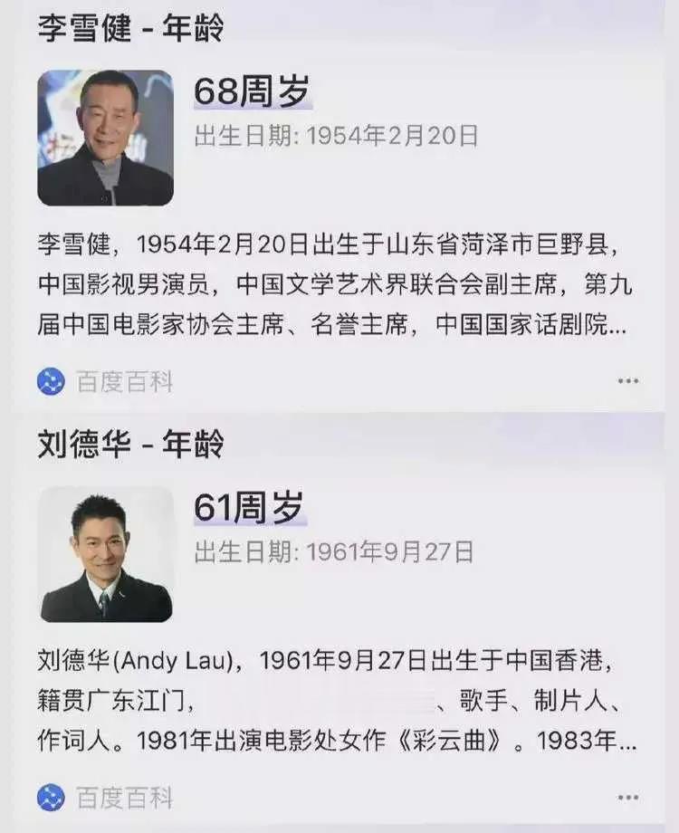刘德华和李雪健都是演艺圈的老前辈,他们在电影界都有着不可替代的地位。然而,最近一场小小的意外却让人们开始关注起了他们的年龄。 当李雪健老师落水后,很多人都在关心他的身体状况。但是,很少有人注意到刘德华在拍摄中也有着大量的水中戏。他和李雪健一样,都是在雨中拍摄,都是在水里泡了很久。但是,为什么大家只关注李雪健的身体状况呢? 刘德华也已经61岁了,只比李雪健小7岁。他虽然长得还很年轻,但是他的年龄已经不小了。然而,很多人却认为他还是年轻人,似乎年龄对他来说并不是问题。 其实,年龄并不是一个人的全部。刘德华和李雪健都是非常优秀的演员,他们的表演才华和演技都是无可挑剔的。他们虽然年龄已经不小,但是他们依然在拍摄中保持着高度的专业精神和出色的表演水平。 因此,我们不应该只关注一个人的年龄,而应该看重他们的才华和专业精神。刘德华和李雪健都是非常优秀的演员,他们的表演才华和专业精神值得我们学习和尊重。让我们一起珍惜这些优秀的演员,为他们点赞!