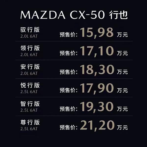 这个预售价还满意吗? 15.98万-21.20万,大尺寸CX-50开启预售。 尺寸4785/1920/1638,轴距2815,车身尺寸这款,不再小气。 这个级别的车,这个预售价也算很亲民了。 但这款车搭载的动力是2.0L+6AT,2.5L+6AT,没有混动车型,动力这块给人感觉是至少是5年前主流的既视感。 后悬置是扭力梁非独立悬置,也是够够的了。 情况就是这么个情况,你们觉得怎么样?
