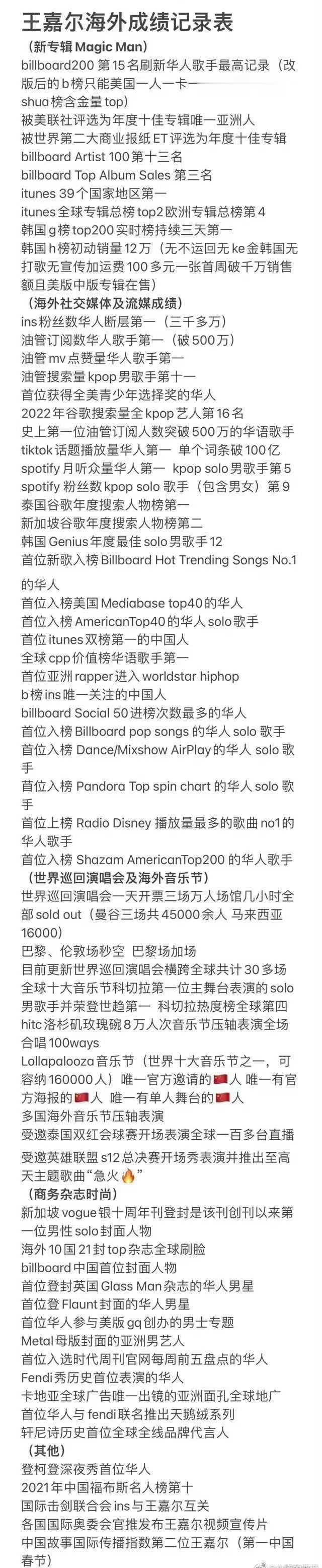 王嘉尔海外实绩🈶️,油管510万+推特700多万+Spotify月收听人数400多万+tiktok话题播放量超过100亿+ins粉丝数三千多万,24号继续看王嘉尔科切拉舞台啦!
