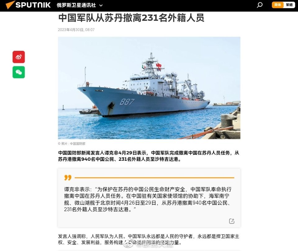 中国国防部新闻发言人谭克非4月29日表示,中国军队完成撤离中国在苏丹人员任务,从苏丹港撤离940名中国公民、231名外籍人员至沙特吉达港。
