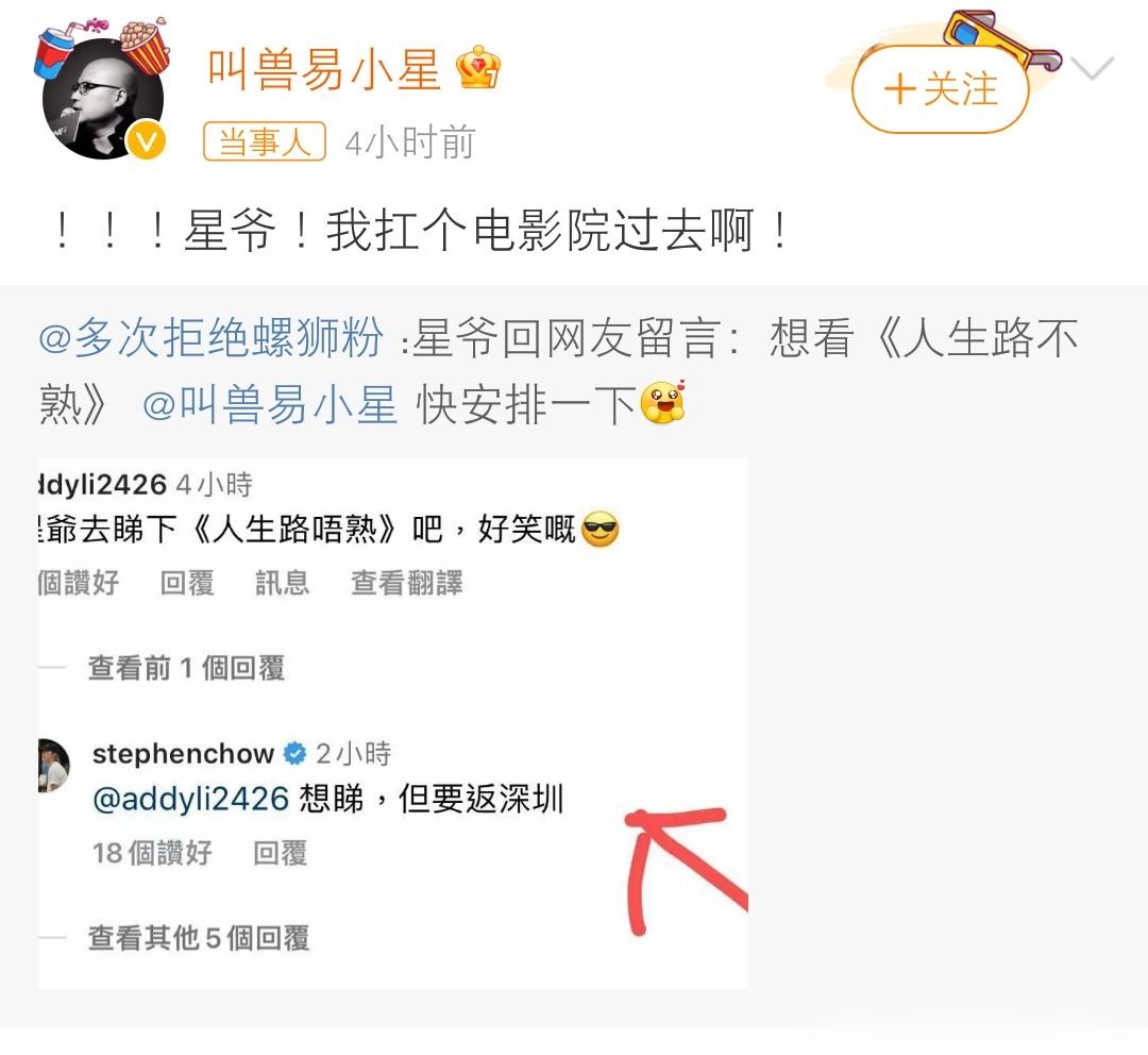 #周星驰想看人生路不熟#周星驰回复网友说想看《人生路不熟》,叫兽易小星准备把电影
