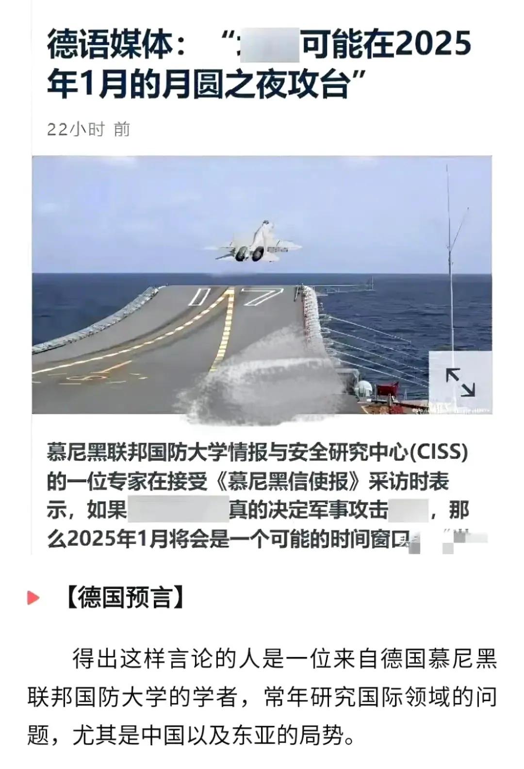德国一家情报机构研究推测,中国将在2025年1月在月圆之夜实现国家统一。据称,这个专家常年研究中国和东亚局势。这个情报机构要么就是非常厉害,通过特殊渠道了解到了非常机密的消息,要么就是瞎扯。因为一般正常人都知道2025年确实有点早,我们的准备还不够充分,一般普遍认为2028至2030年间是一个比较可能的时间。到底是哪一年,我们还是拭目以待吧。