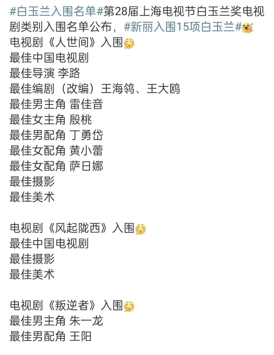 #新丽赢很大# 新丽出品的好剧,相信很多人都看过吧!感觉这些剧每一部我都好爱呢!《人世间》《父母爱情》《庆余年》《我的前半生》《赘婿》《北京爱情故事》《叛逆者》《流金岁月》《风起陇西》 《骄阳伴我》《与凤行》《玫瑰故事》,哪一部是你的心中最佳呢?#新丽原来有这么多好剧#