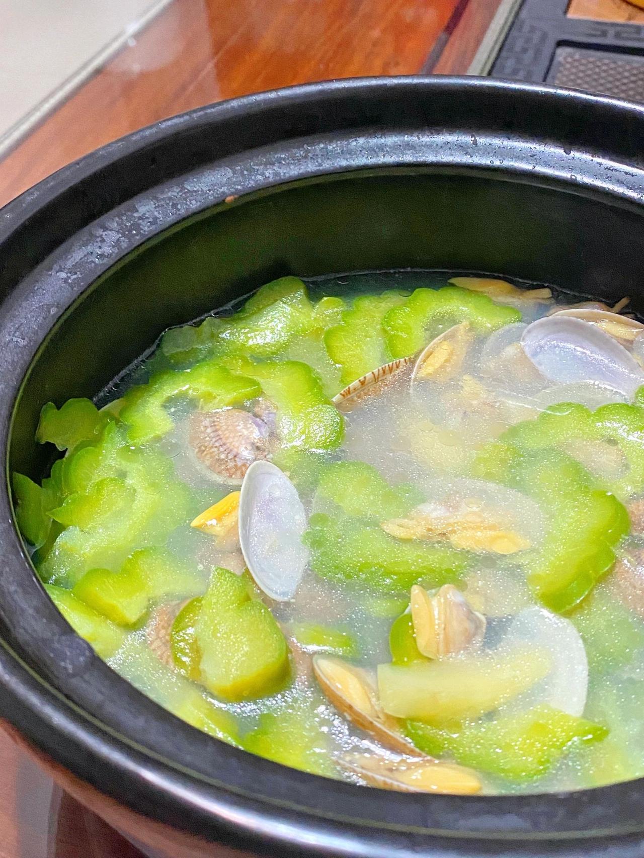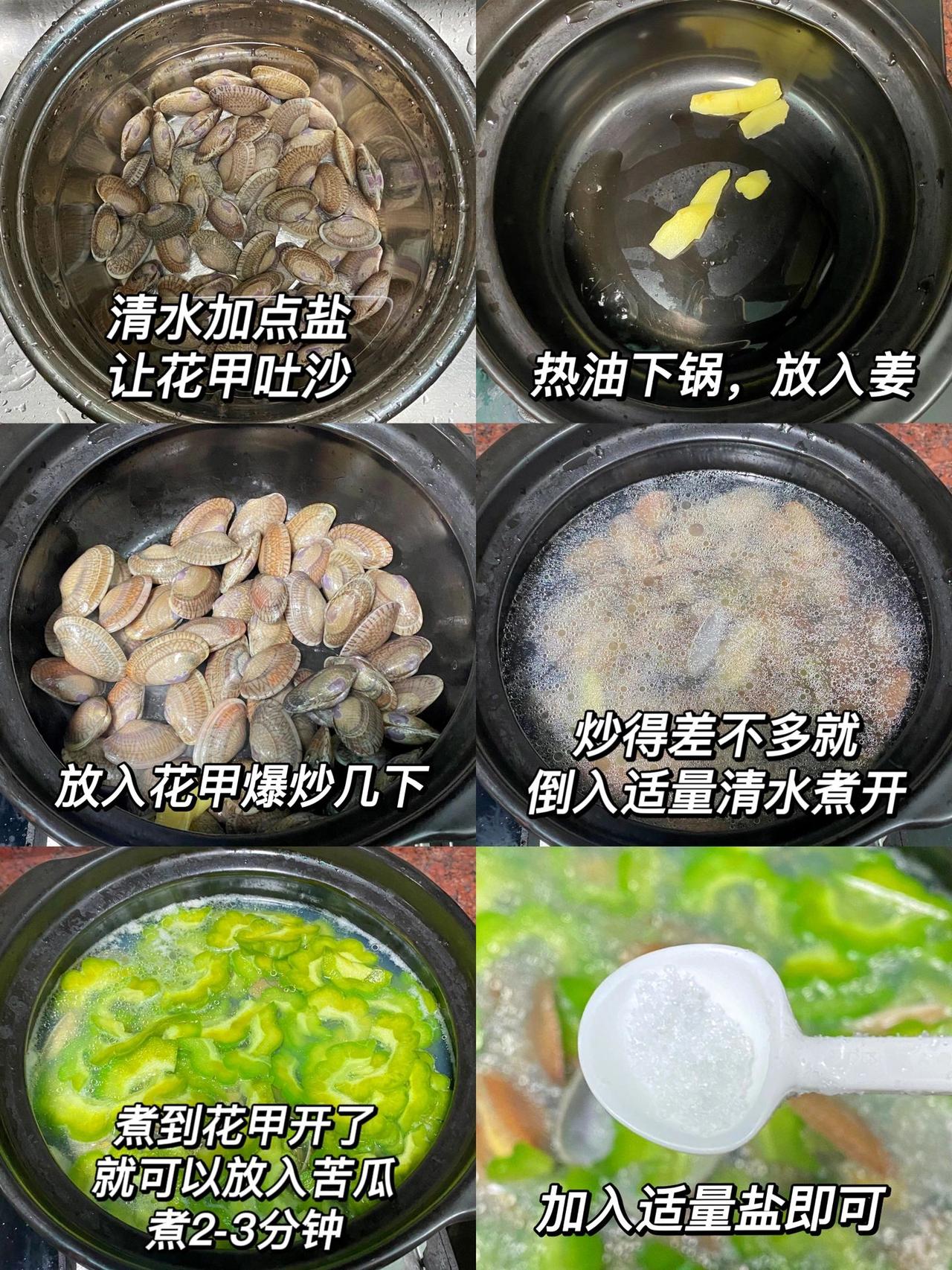 夏天清热败火,懒人超爱的花甲苦瓜汤 广东的夏天,只想喝清爽的汤,这一款花甲苦瓜汤,绝对是夏日必备!简单易做,有手就会,不需要太多的时间和材料,懒人福音啊! 食材:新鲜花甲、苦瓜 配料:生姜、盐 做法:1、清水里加入适量盐,让花甲快速吐沙 2、热油下锅,放入生姜炒出姜味,接着放入花甲爆炒几下 3、倒入适量的清水煮开 4、煮到花甲开了,就可以放入苦瓜,煮2-3分钟,加入适量盐就可以啦!
