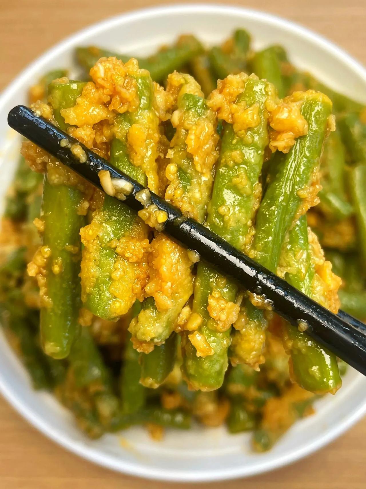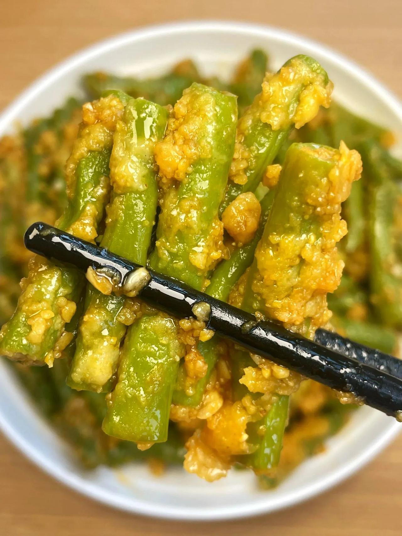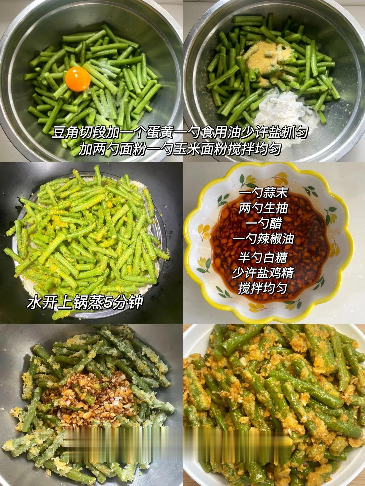 万万没想到,豆角上锅蒸一蒸,竟这么好吃! 豆角的新吃法,无敌了!既能当饭又能当菜,太好吃了! 做法: 1、豆角切段加一个蛋黄、一勺食用油、少许盐抓匀,再加两勺面粉、一勺玉米面粉搅拌均匀; 2、调酱汁:碗中放一勺蒜末、两勺生抽、一勺醋、一勺辣椒油、半勺白糖、少许盐、鸡精搅拌均匀; 3、水开上锅蒸5分钟,豆角蒸熟晾凉倒入酱汁拌匀即可。
