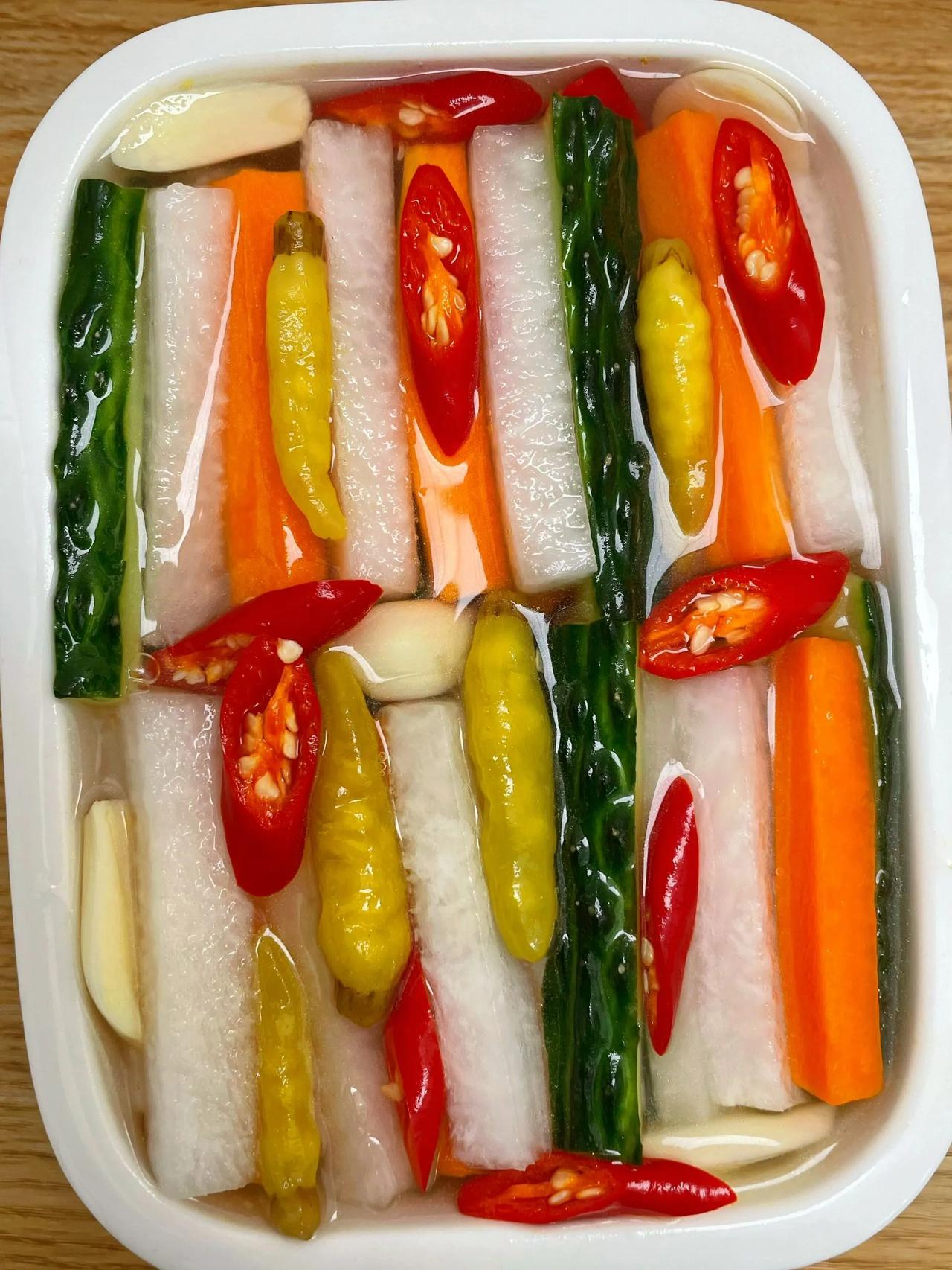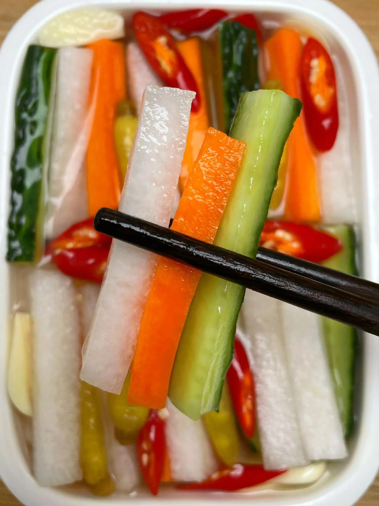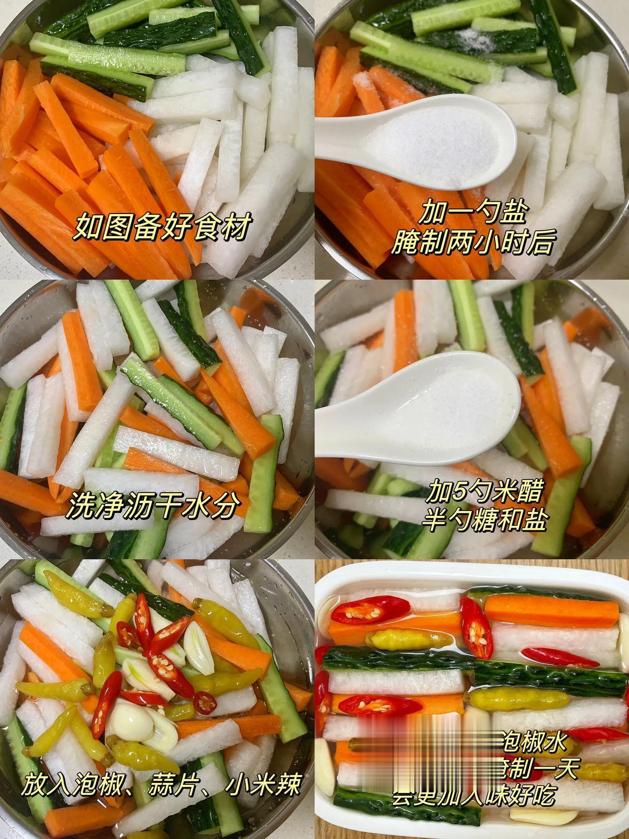 爽口下饭!夏季香辣泡椒腌泡菜萝卜黄瓜! 做法: 1、所有食材一勺盐腌制两小时后洗净沥干水分,加5勺米醋、半勺糖、盐、泡椒、蒜片、小米辣、适量清水、泡椒水; 2、放冰箱冷藏腌制一天即可。