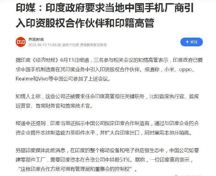 印度要求当地中国手机厂商引入印资股权和印籍高管。根据印度《经济时报》报道,印度政府已要求中国手机制造商在其印度业务中引入印资股权合作伙伴。小米、OPPO、VIVO、Realme等在内的中国公司被印度政府约见就此事进行了会谈。据了解印度政府还提出要指定印度合作制造商,通过中印合资企业提高本国制造能力。同时还提出雇佣本地分销商等要求。而据此前消息,印度要求中国在印度建立的移动设备零件工厂印度要在合资企业中占51%的股份。一位印度高官表示,这样印方就能拥有管理层和董事会的控制权。