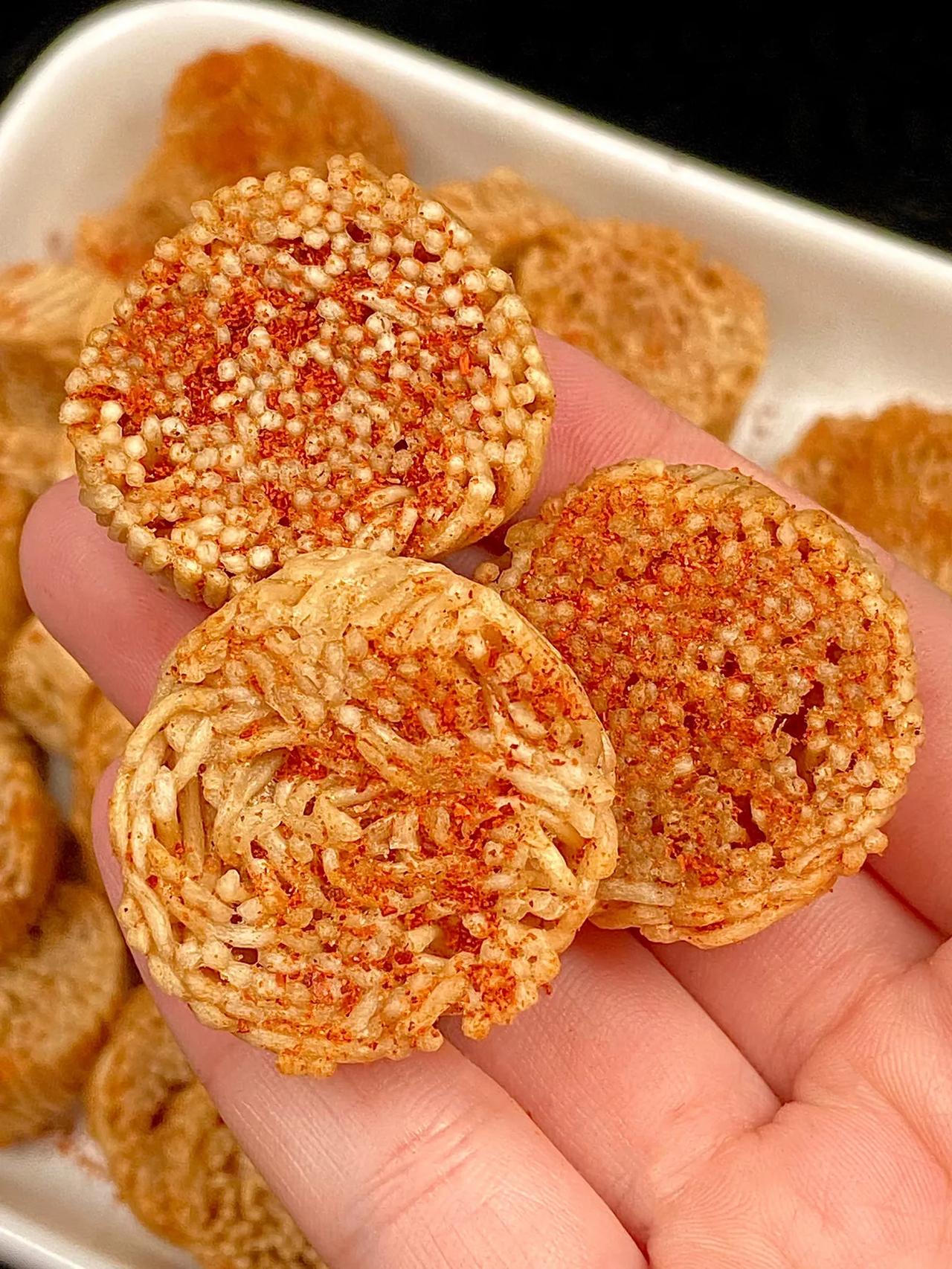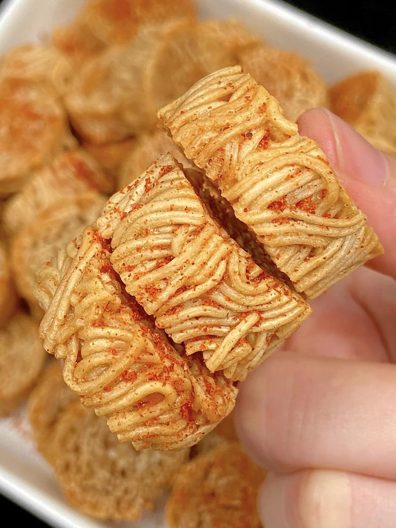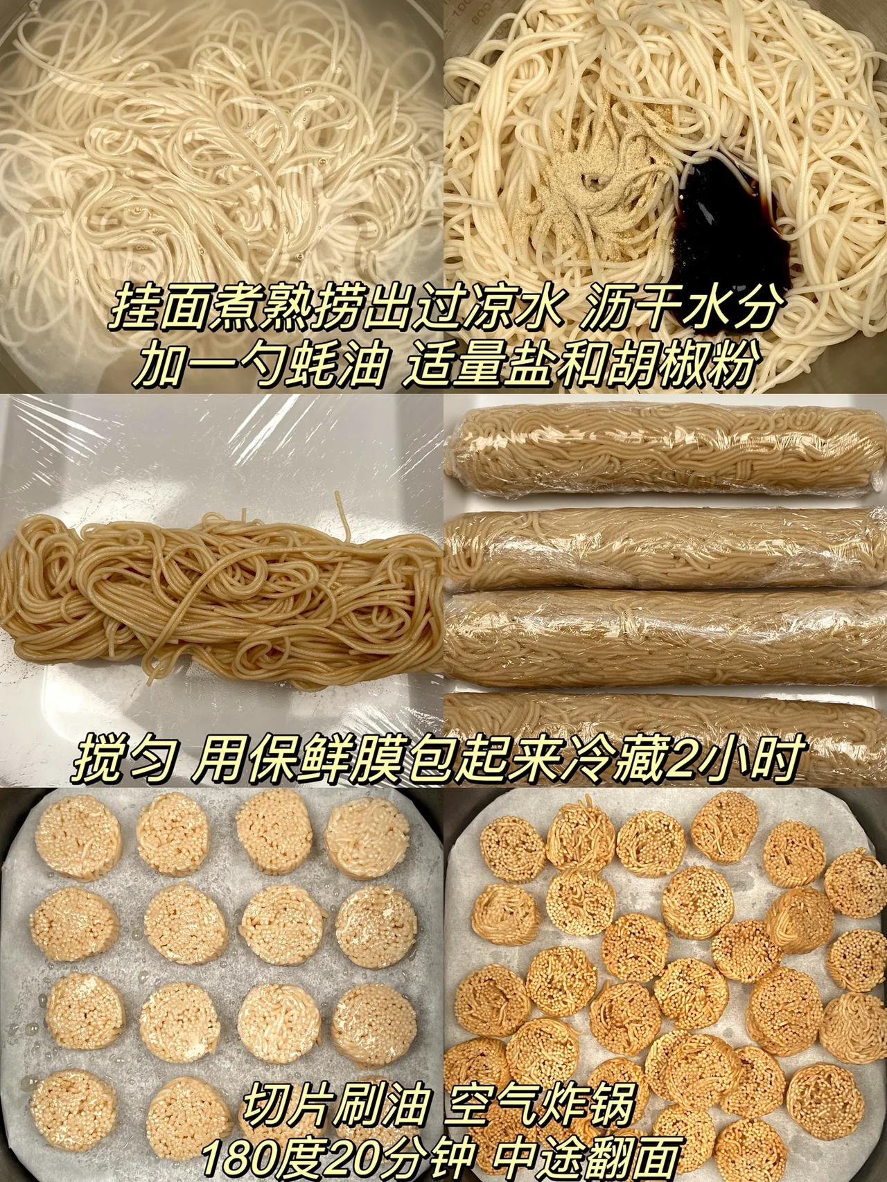 不能让空气炸锅闲置之~空气炸锅干脆面! 用空气炸锅做干脆面!吃的不是干脆面,是情怀!脆脆香香的,做法超简单的小零食! 做法: 1、挂面煮熟捞出过凉水,沥干水分后加一勺蚝油 、适量盐、胡椒粉搅匀; 2、用保鲜膜包起来冷藏2小时; 3、冷藏好后取出切片刷油,放入空气炸锅180度20分钟,中途翻面即可。
