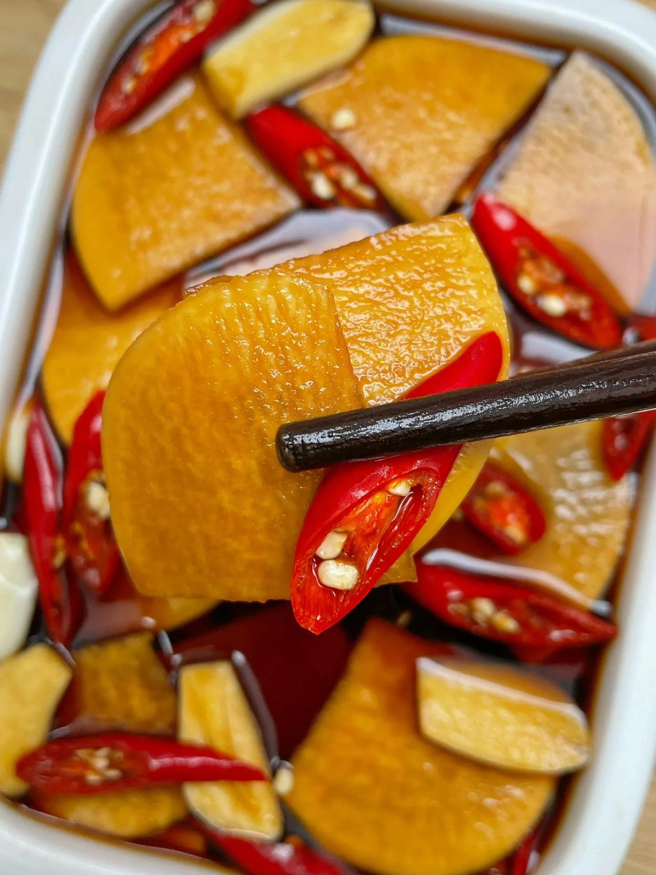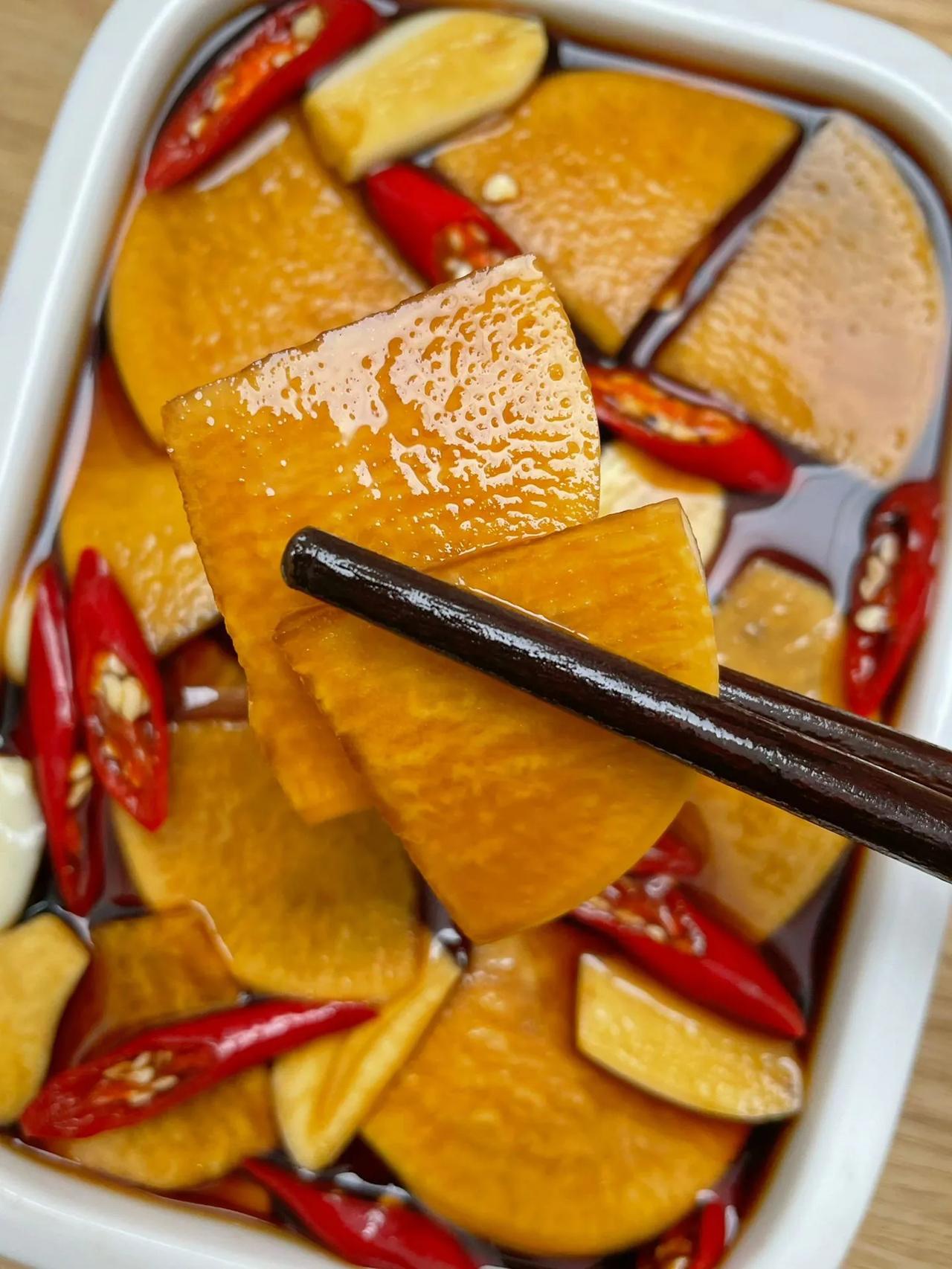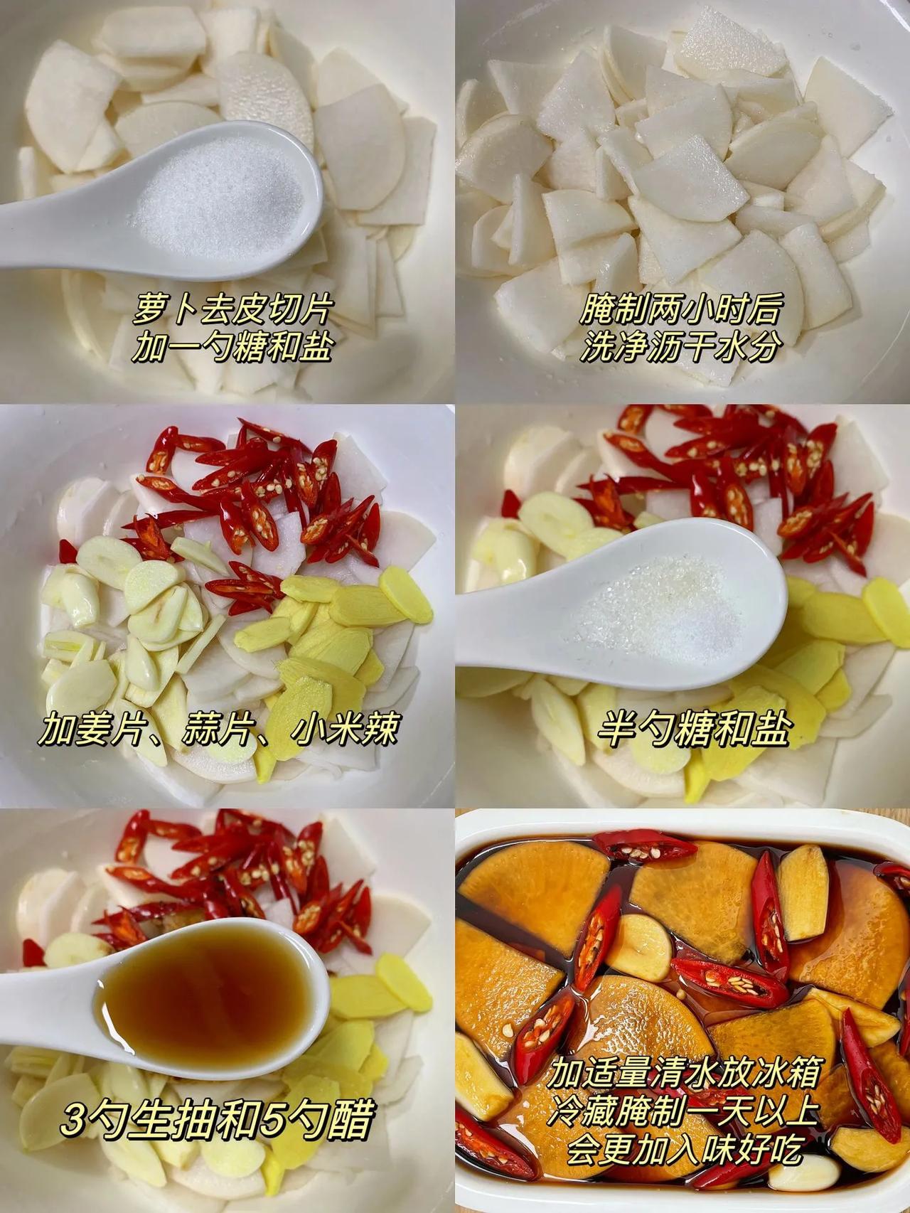 夏季下饭香辣脆爽腌萝卜片! 做法: 1、萝卜去皮切片,加一勺糖和盐腌制两小时后,洗净沥干水分; 2、加姜片、蒜片、小米辣、半勺糖、半勺盐、3勺生抽、5勺醋,加适量清水,放冰箱冷藏腌制一天以上即可。