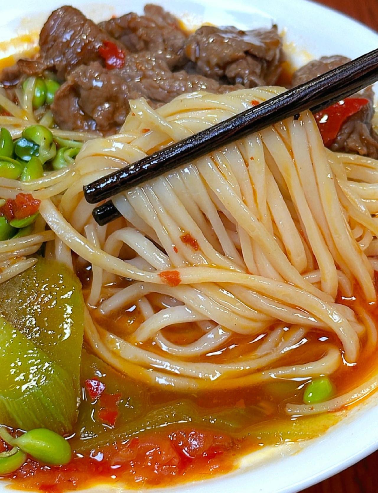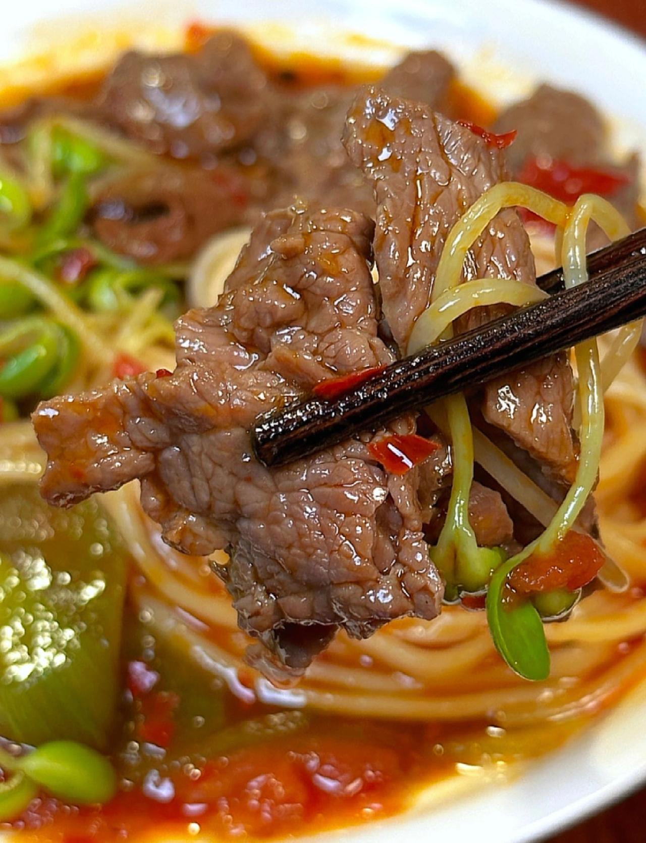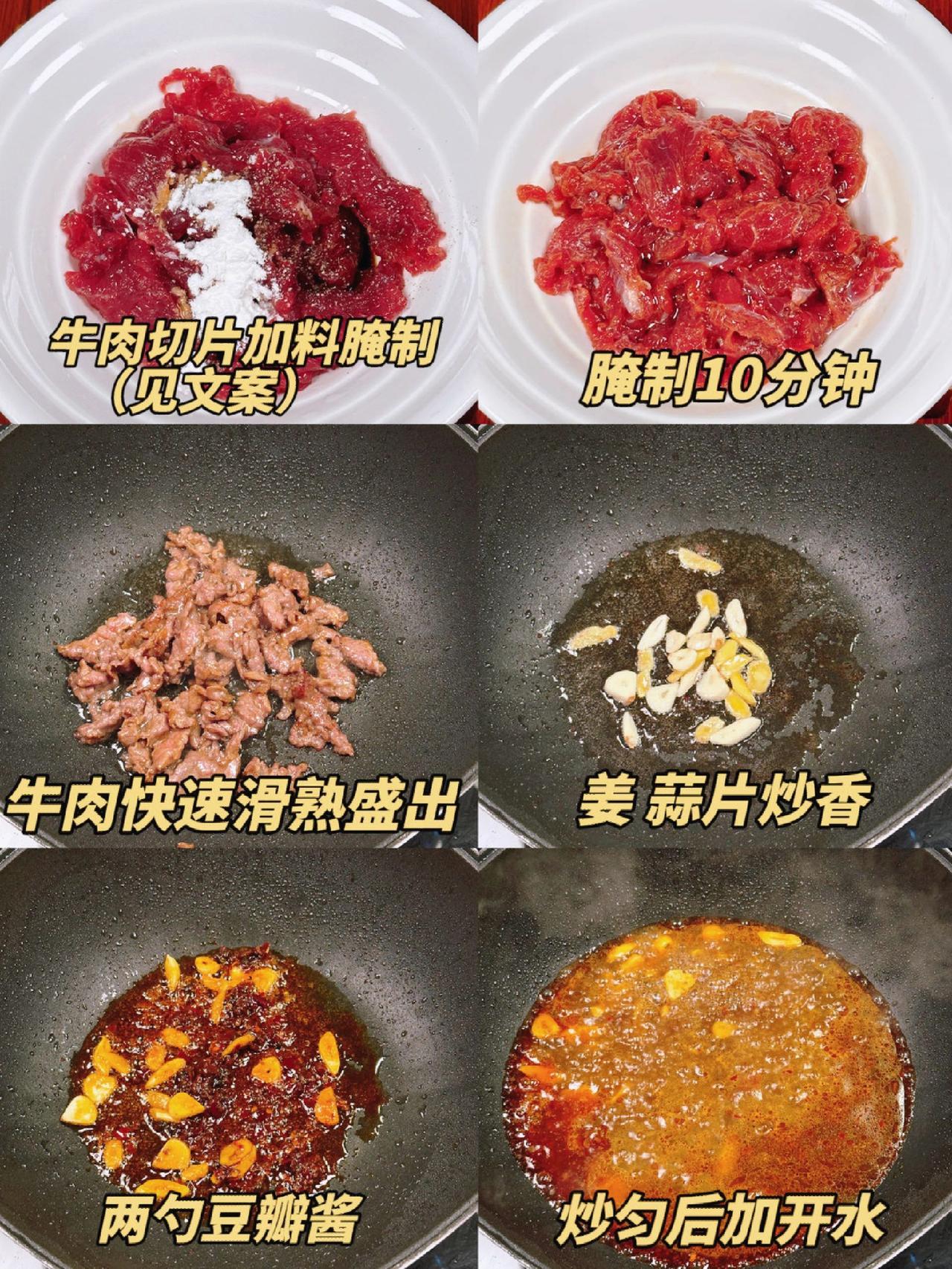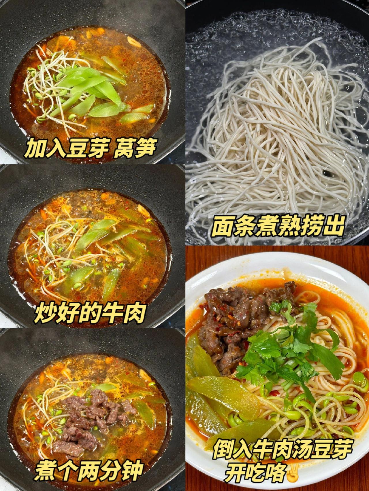 这碗牛肉面真的爱了!想吃谁做的就艾特谁~ 晚上加班回家,这就是我的深夜救赎!香香辣辣的,牛肉嫩嫩的~真滴泰香啦! 食材:牛肉200g,面条1份,豆芽,莴笋,香菜 做法: tips:腌制牛肉:牛肉切薄片,加一勺生抽➕料酒、老抽各半勺➕少许胡椒粉➕淀粉半勺➕一勺油,抓匀后腌制10分钟便于好入味 1、热锅热油,倒牛肉快速滑熟盛出,姜蒜片炒香后加两勺豆瓣酱炒匀,加开水。 2、接着放豆芽,莴笋,牛肉煮两分钟。 3、水开下自己喜欢吃的面条,煮熟捞出,倒入牛肉汤豆芽开吃啦。 面条鲜辣过瘾,牛肉嫩嫩的,真滴泰香辣