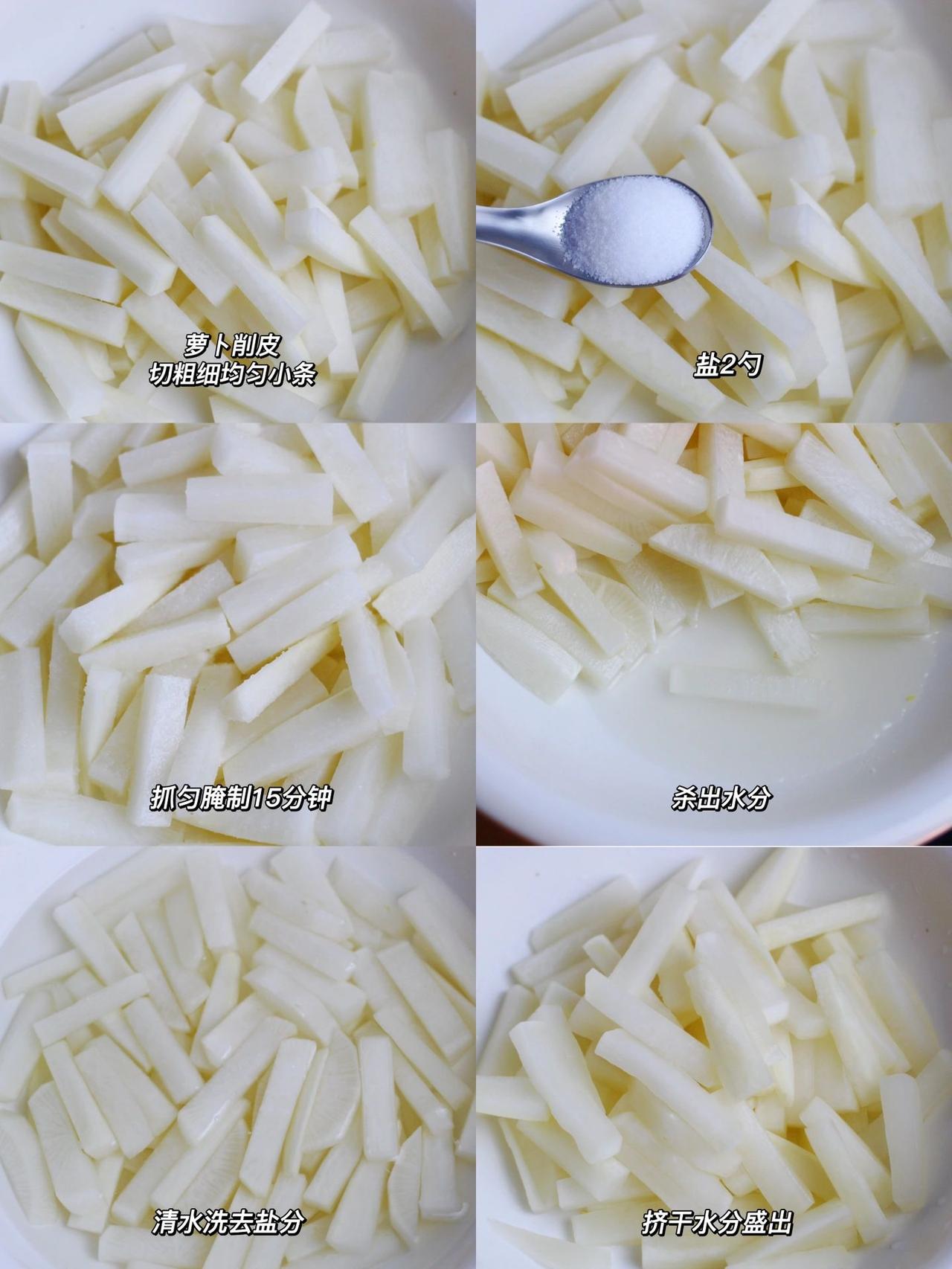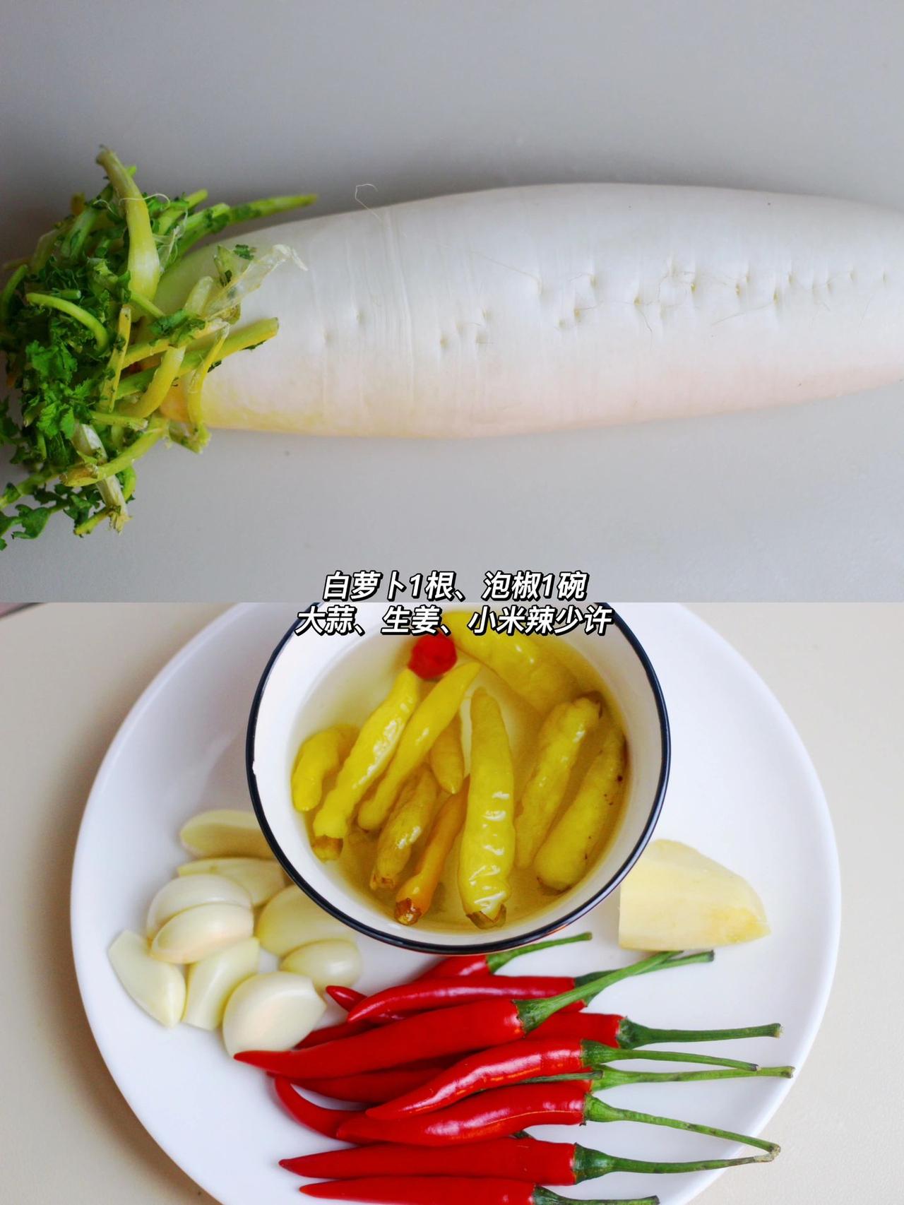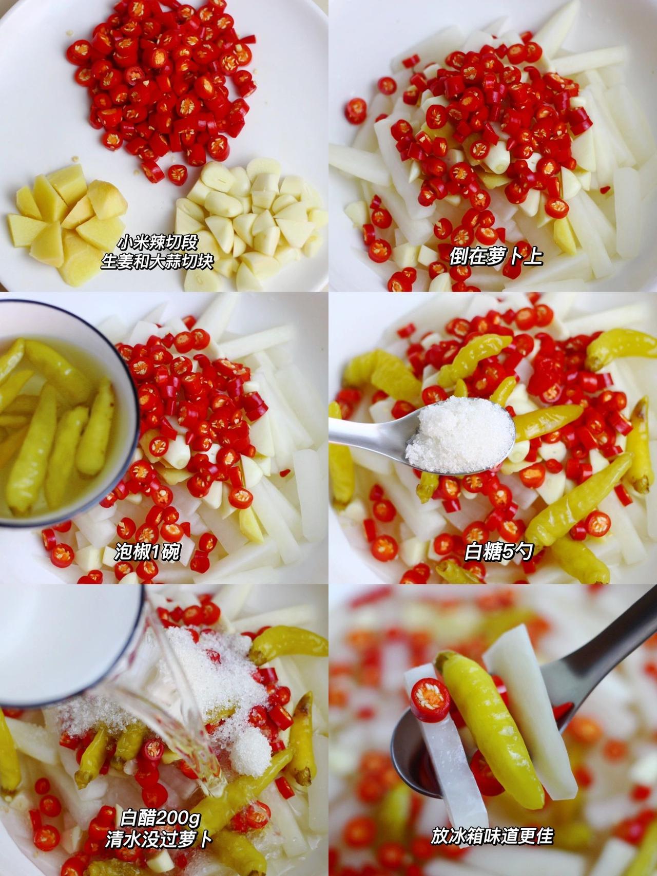 炸鸡店同款萝卜!酸辣爽脆,做法巨简单! 2小时就能吃上的萝卜做法,你确定不进来看看?? 准备食材:白萝卜1根、泡椒1碗、大蒜、生姜、小米辣少许 1. 萝卜削皮,切成粗细均匀小条,加2勺盐,抓匀腌制15分钟杀出水分,用清水洗去盐味并挤干水分 2. 小米辣切段、生姜和大蒜切块 3. 碗中放入萝卜条,加生姜和大蒜、小米辣半碗、泡椒1碗、白糖5勺、白醋200g、清水没过萝卜后搅拌均匀,放冰箱里口味更佳